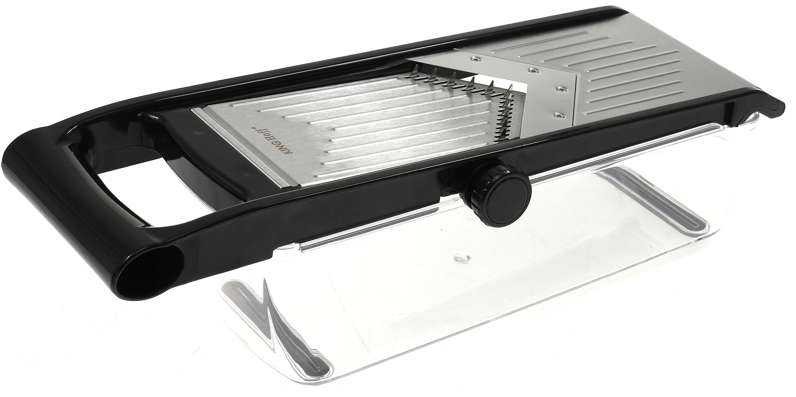 Якісний багатофункціональний слайсер з контейнером, який дозволяє легко нарізати картоплю фрі або подрібнити овочі для салату.
