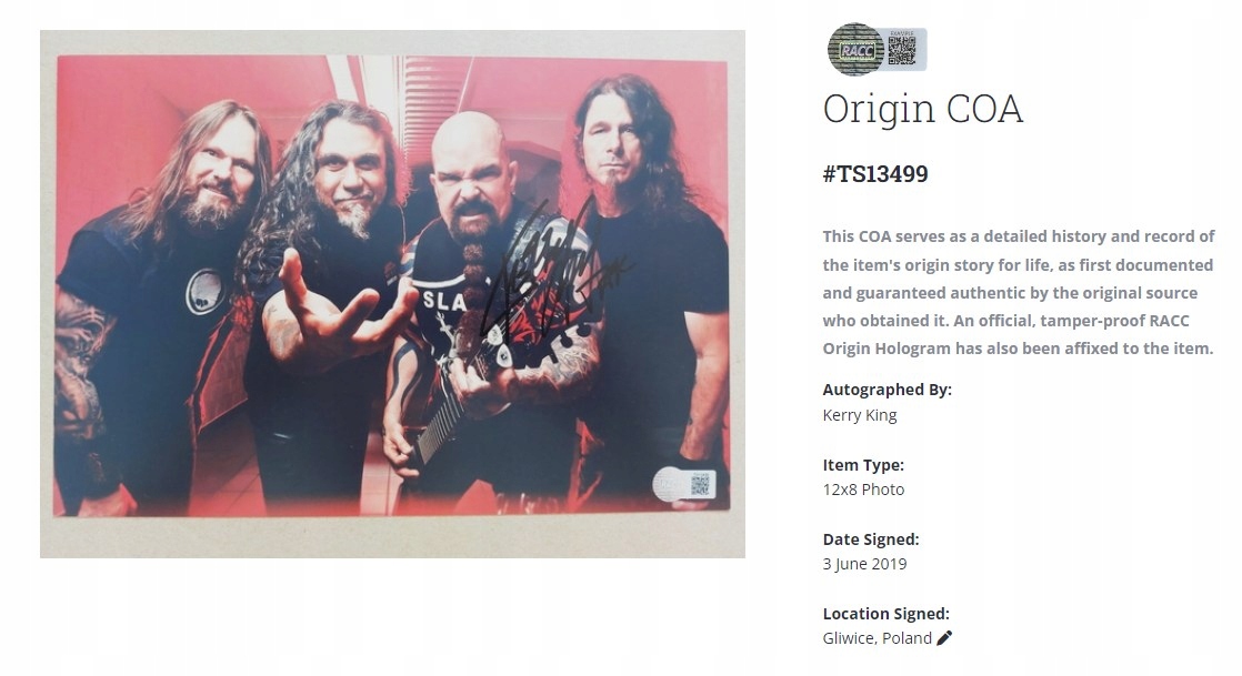 Автограф має оригінальний сертифікат справжності автографів, виданий відомою американською компанією у вигляді голограмної наклейки з QR-кодом. код. Сканування QR-коду приведе вас до сертифіката в електронному вигляді, який також доступний за такою адресою: