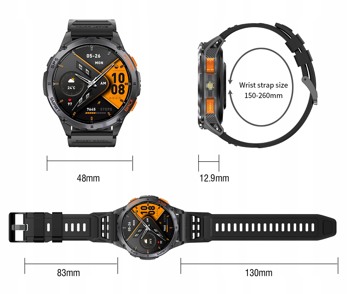 • Додаткові функції: компас, барометр, ліхтарик, будильник, секундомір, таймер, калькулятор, музичний плеєр, голосовий помічник, погода, пульс, bp, spo2, монітор сну, монітор стресу.