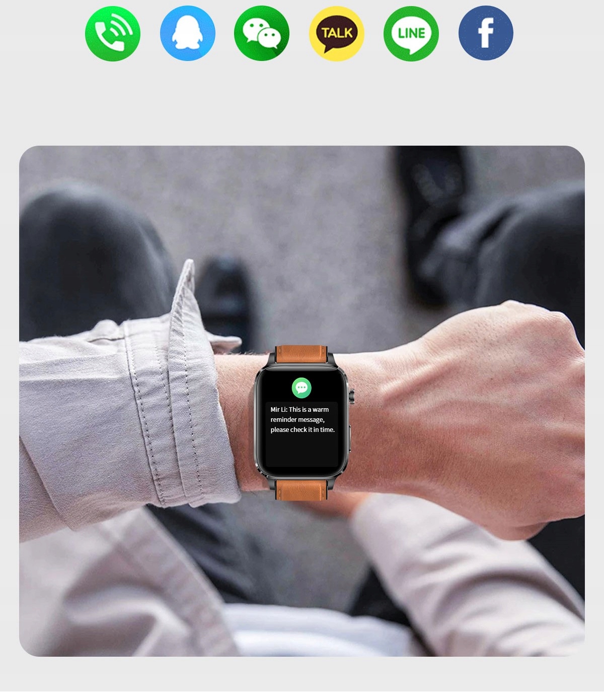 Встановіть у програмі HealthWear, які програми мають надсилати сповіщення та повідомлення на годинник і будьте в курсі подій. Більше не потрібно лізти до кишені, коли ви отримуєте текстове повідомлення. Відтепер ви можете читати це на своєму годиннику! Годинник приймає сповіщення від популярних програм, таких якMessenger або WhatsApp.