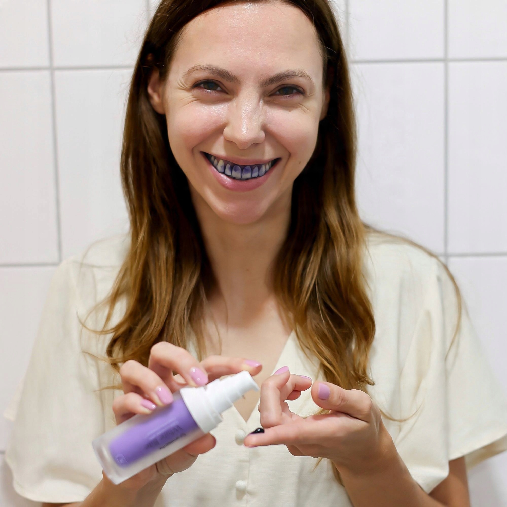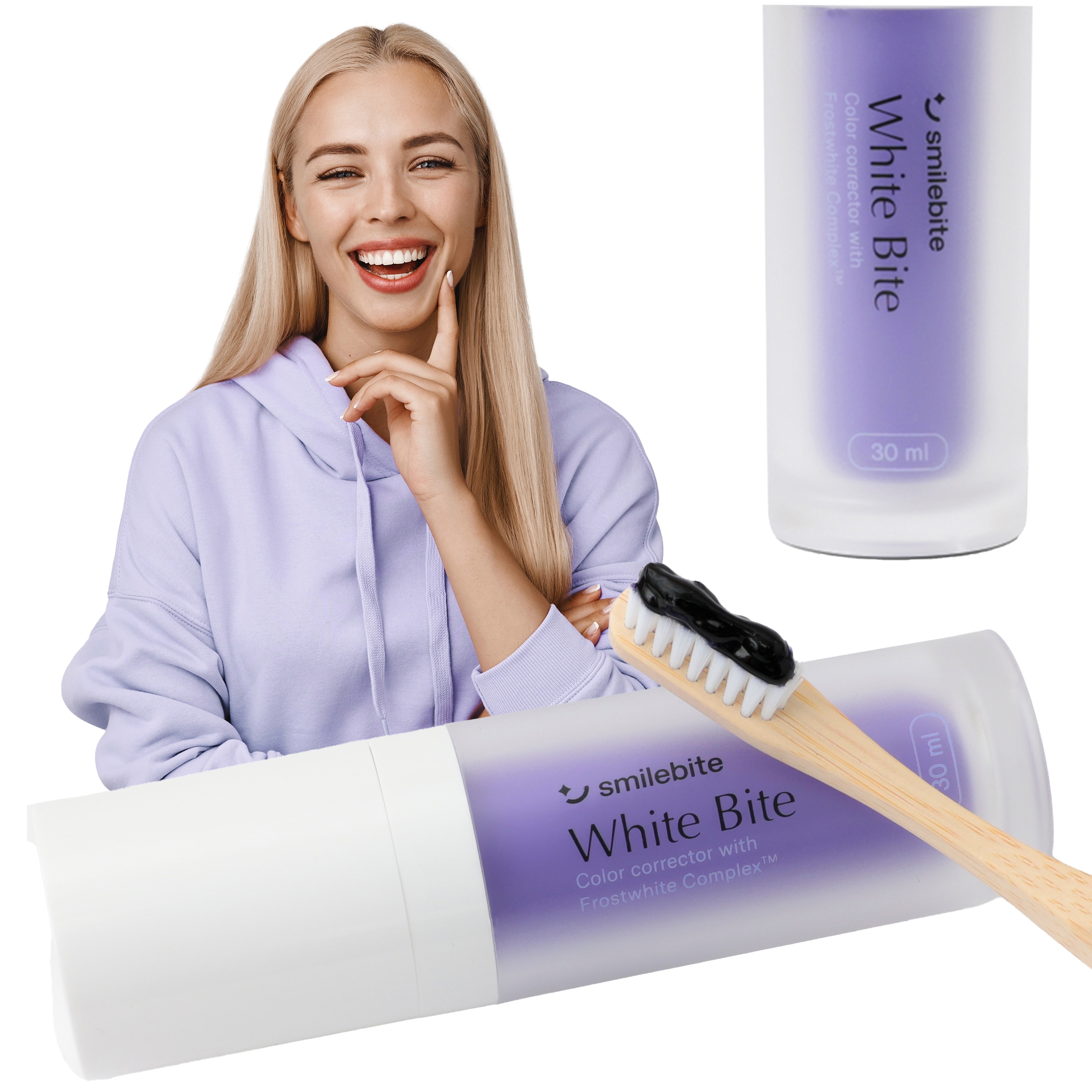 Smilebite White Bite color corrector – це революційна гелева відбілююча паста, яка завдяки передовій технології Frostwhite Complex TM ефективно нейтралізує жовті відтінки зубів. . Спеціально розроблена формула з фіолетовими пігментами усуває знебарвлення та підкреслює ефект відбілювання, забезпечуючи миттєве покращення кольору зубів. Це ідеальне рішення для всіх, хто хоче миттєво освітлити свою посмішку, забезпечивши при цьому безпеку і здоров'я емалі.