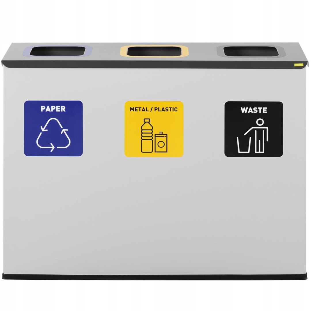кошик для сміття Ulsonix буде працювати на публіці, роботи чи будинку. Завдяки трьом камерам ви можете розділити сміття до 180 л за допомогою системи сегрегації. Незалежно від того, чи це приблизно папір, змішані відходи або пластик , кожна камера чітко позначена і має великий отвір, через який ви викидете відходи. Все, що вам потрібно зробити, - це прикріпити мішки до барвистих рамок. Контейнер був виготовлений з лакованої сталі. Суцільну конструкцію легко встановити де завгодно. гумове дно гарантує стабільну підтримку і не ковзає. гладкі поверхні Ви просто очищаєтесь з вологою тканиною, завдяки якому відро завжди залишатиметься привабливим гігієнічним. Завдяки матеріалу та срібному кольору, сміттєвий контейнер створює враження про враження сучасного та тонкого. Таким чином, ви можете використовувати його в різних місцях, таких як громадські простори, компанії чи ресторани.