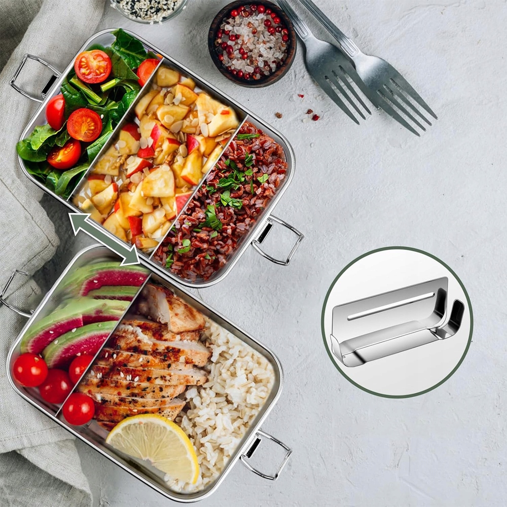 Функціональні 3 камери: Дві знімні відсіки ділять контейнер на три окремі секції. Ідеально ви відокремлюєте їжу, запобігаючи змішуванню запахів. Упакуйте бутерброди, овочі, фрукти, горіхи та соуси без страху.