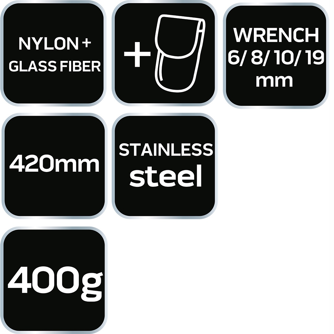 Тактична сокира 63-178 від NEO TOOLS — інструмент із функціями молотка, сокири та торцевих ключів. Він характеризується лезом з міцної нержавіючої сталі 3Cr13 і рукояткою з нейлону і скловолокна. Пропонується в комплекті з нейлоновим чохлом з практичним тримачем для пояса. Загальна довжина сокири 42 см, довжина леза 12,7 см. Ширина леза 14 см, товщина 5,6 мм. Товщина молотка 17,5 мм. Вага інструменту 400 г. Додаткові елементи цього сокирки включають молоток і гайкові ключі на розміри: 8, 10, 12, 13, 14, 17, 19 мм. Інструмент, рекомендований для ентузіастів бушкрафту та любителів гаджетів.