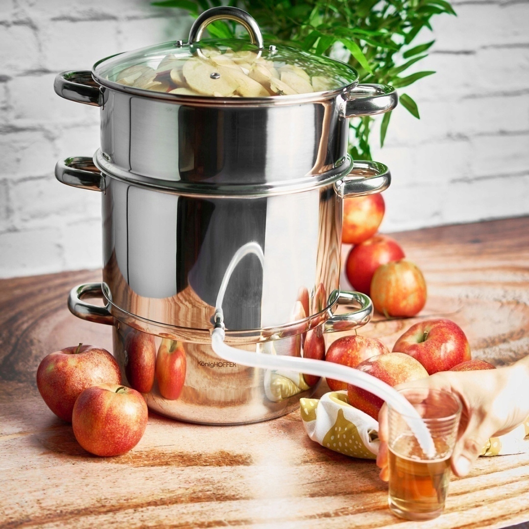 Елементи набору: - ємність для фруктів, загальна місткість: 8,2 л, довжина з ручками: 36 см, діаметр верхній: 27,5 см, діаметр нижній: 24 см, висота: 16 см - ємність для збору соку, загальна місткість: 8 л, довжина з ручками: 36 см, верхній діаметр: 27,5 см, нижній діаметр: 26 см, висота: 15 см - каструля для води, загальна місткість: 4,5 л, довжина з ручками: 34 см, верхній діаметр: 26 см, нижня діаметр: 22 см, висота: 12 см - кришка термостійка, діаметр: 26 см, висота: 2 см - шланг з хомутом, довжина: 42 см, діаметр отвору: 1 см.