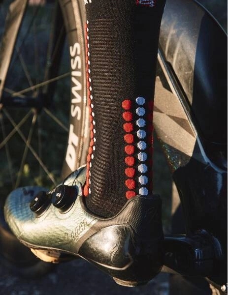 Proracing Socks V4 Bike - остання модель швейцарського бренду Compressport. Велосипедні шкарпетки були створені, щоб забезпечити вам комфорт та зручність, де б ви не їздили незалежно від переважаючих погодних умов. Нова версія змінила матеріал - тепер він ще м'якший і приємніший до шкіри. Він також характеризується кращою диханням та вологою. Сітчасті панелі, розміщені в чутливих місцях, покращують потік повітря та терморегуляцію, що особливо важливо під час теплої та спекотної погоди. Технологія Aero.dots покращує аеродинамічні властивості шкарпеток, регулюючи потік повітря через них і, таким чином, мінімізуючи опір повітря.