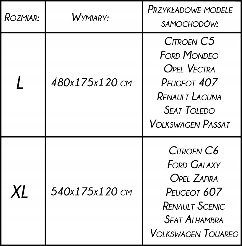 Розмір XL - 540x175x120 см (таблиця з прикладами моделей автомобілів нижче)