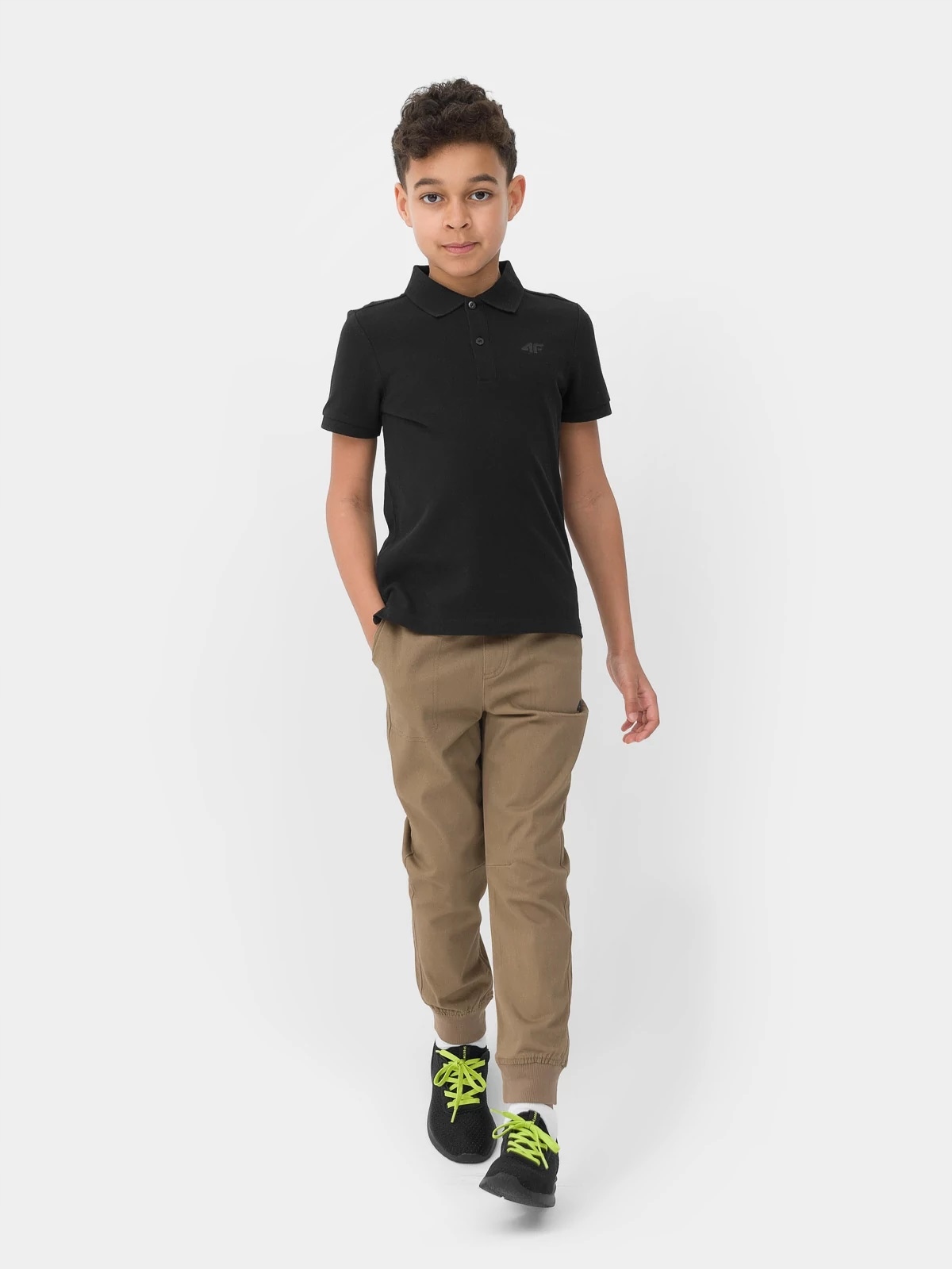 дитячі штани для хлопчика 4F. Вони ідеально підходять для фізичних навантажень та для повсякденного використання. Виготовлений з високоякісної бавовняної та поліестерної суміші. Вони були обладнані двома бічними кишенями. Ноги закінчилися зварюваннями, а регульований ремінь дозволяє відповідати точній тілі.