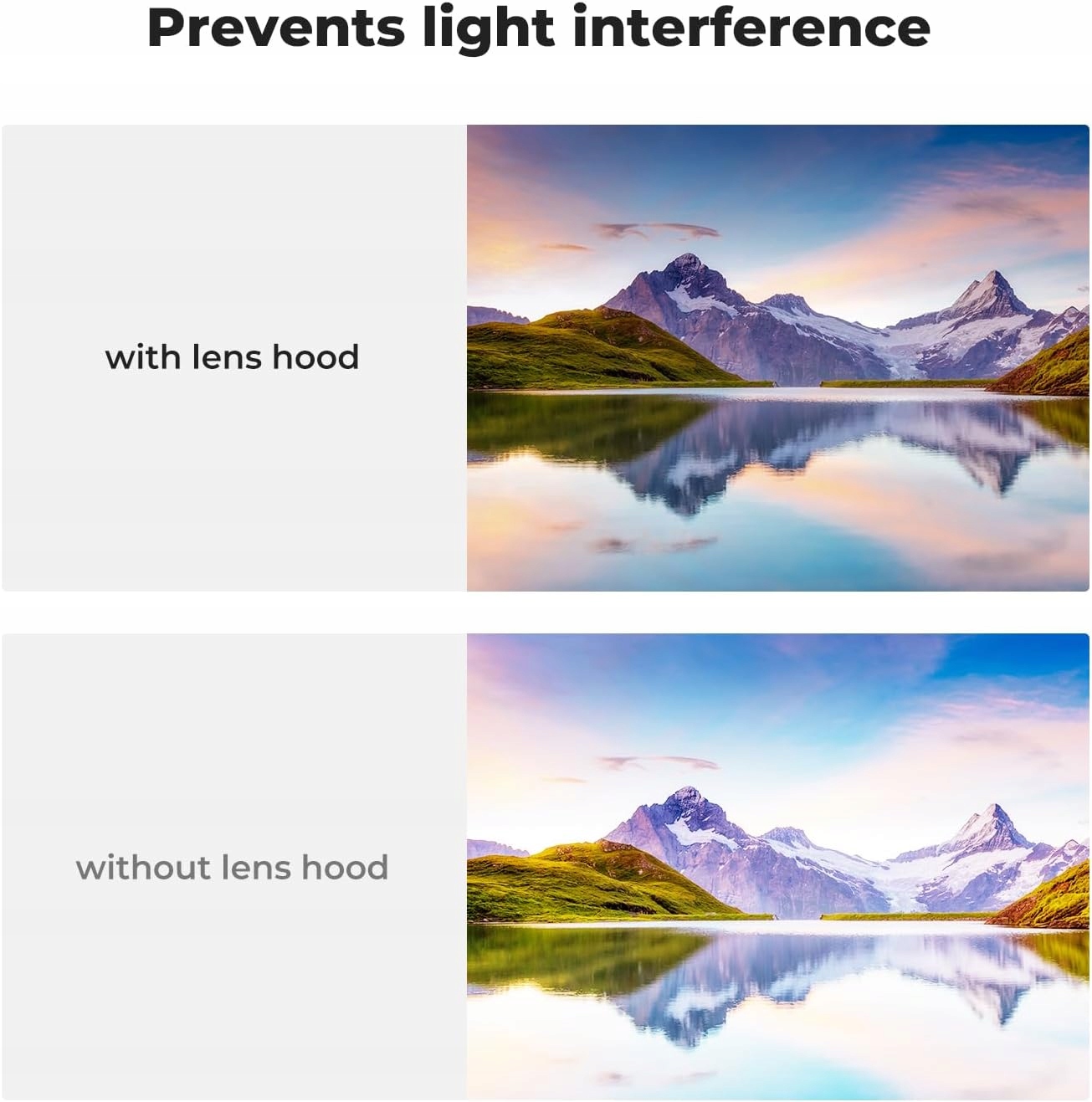- Зменшення контрастності фотографії, спричиненої інтерференцією світлових хвиль, що досягають об’єктива під гострим кутом