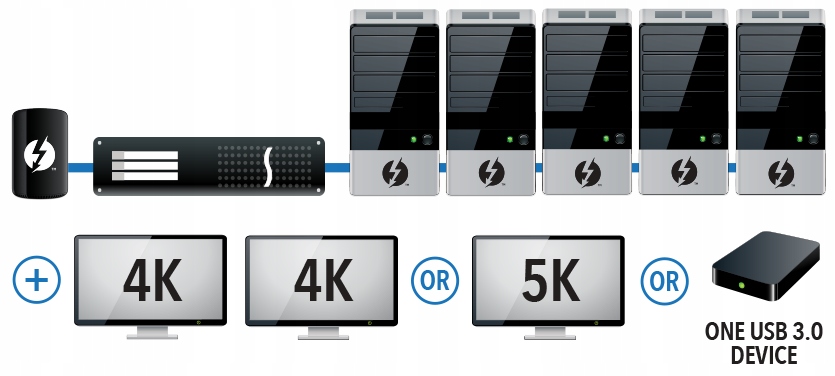 • До трьох карток PCIe можна використовувати з будь-яким комп’ютером Thunderbolt 3 Mac або Windows — одночасно можна використовувати кілька високоякісних карток PCIe