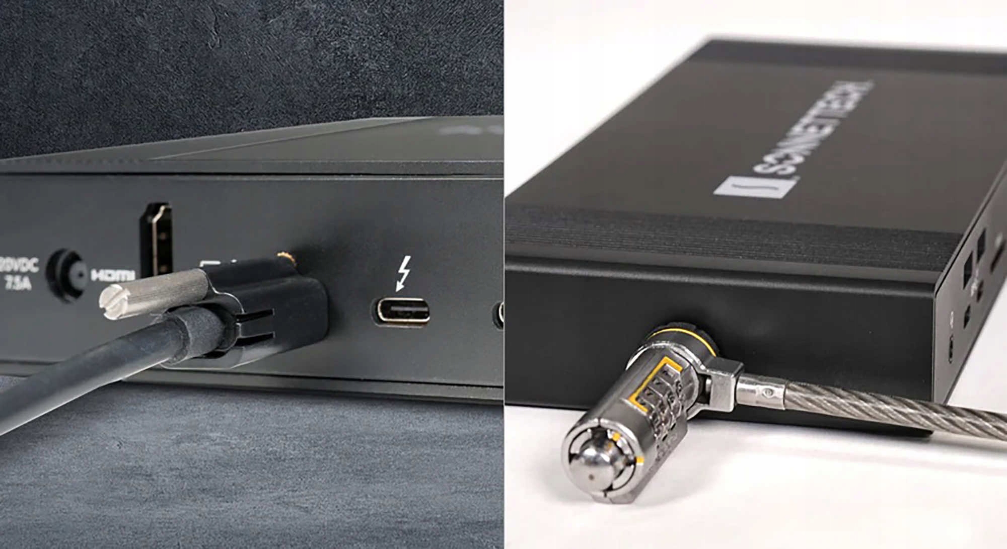 Thunderbolt 4 і ThunderLok 4 Cable – Sonnet містить кабель Thunderbolt і затиск безпеки для Echo 20 SuperDock. Кабель Thunderbolt підтримує повну пропускну здатність 40 Гбіт/с і заряджання 100 Вт. Затиск ThunderLok™ 4 Thunderbolt запобігає випадковому від’єднанню кабелю, легко пересуваючи один кінець кабелю та прикріплюючи його безпосередньо до док-станції за допомогою гвинта. Завдяки своїй унікальній конструкції ThunderLok залишається на кабелі, тож він не загубиться, коли він не використовується.