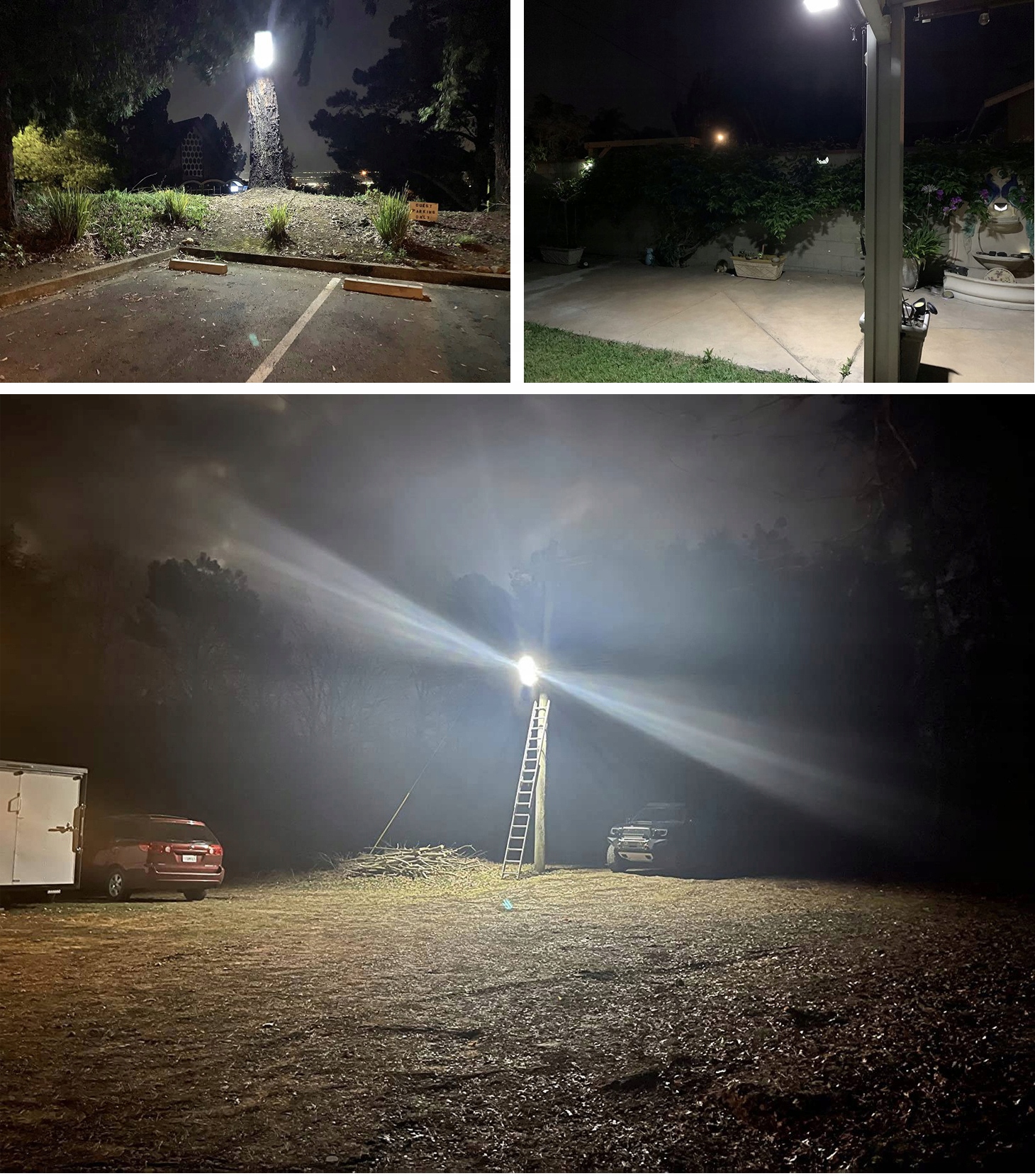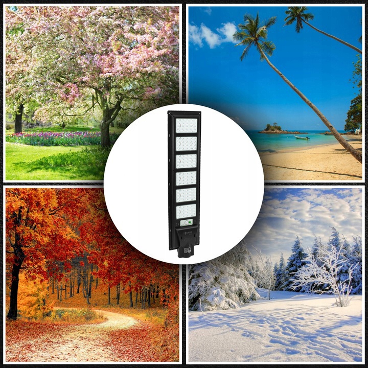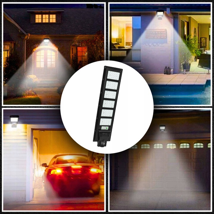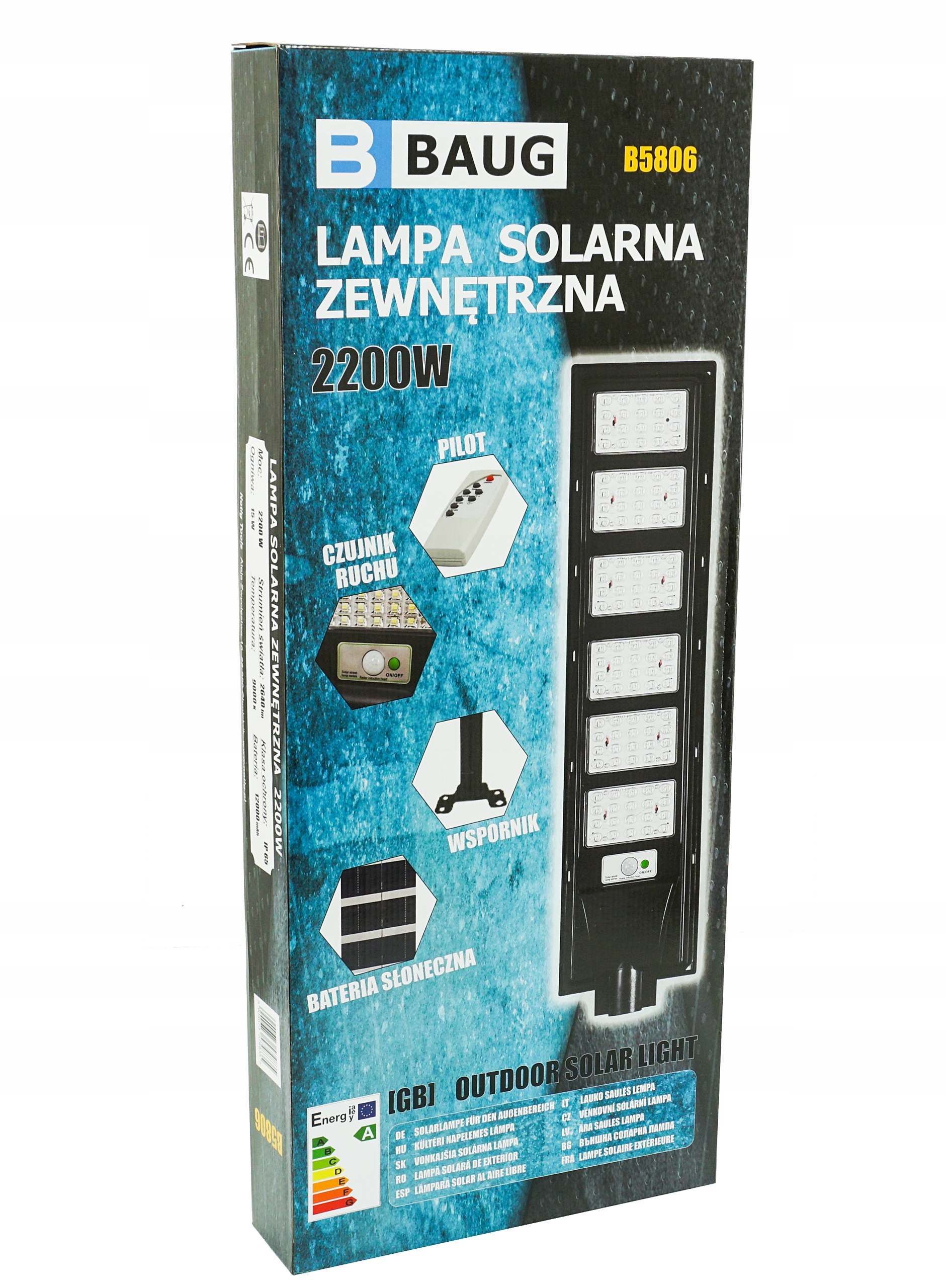 Зовнішня сонячна лампа 2200 Вт. У верхній частині лампи розташована сонячна панель, яка збирає сонячну енергію протягом дня та накопичується у вбудованому акумуляторі. Після настання темряви лампа використовує раніше накопичену енергію для живлення світлодіодів і забезпечення освітлення. Вбудовані в пристрій датчики руху і сутінків забезпечують включення світильника тільки в разі потреби. Комбінація датчиків дозволяє лампі працювати тільки в темний час доби за умови виявлення руху. Лампа оснащена трьома режимами, що відрізняються інтенсивністю світла. У комплект входить ІЧ-пульт дистанційного керування функціями світильника.