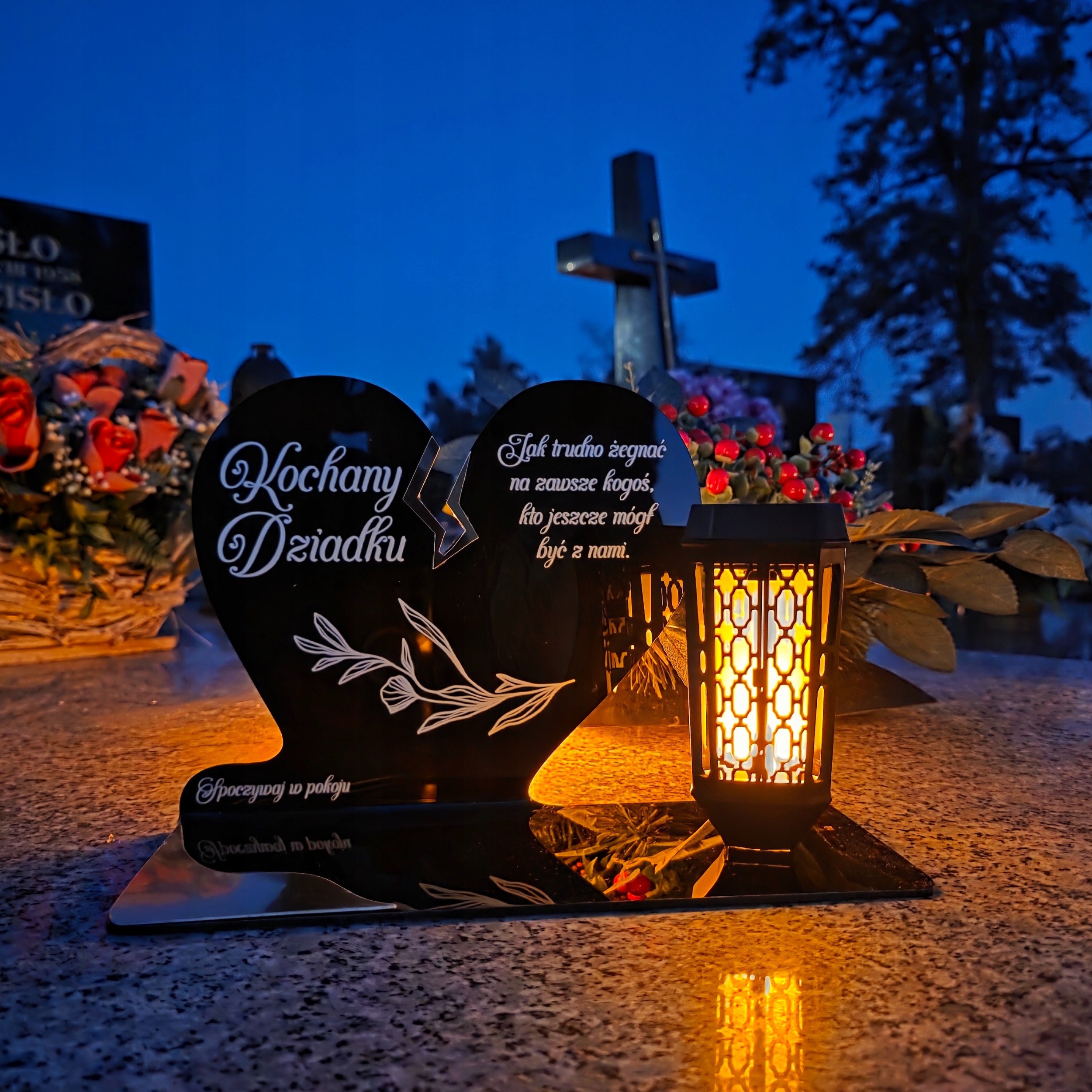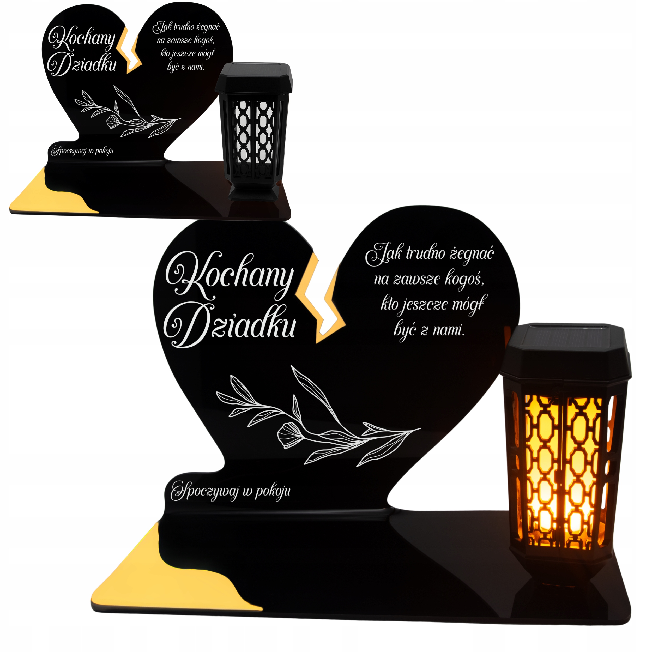 Ця унікальна надгробна свічка у вигляді чорного серця з тонкою золотистою тріщинкою - прекрасний символ любові та пам'яті, яка не згасає. Присвята «Любому дідусю» та тонкий орнамент надають усьому зворушливого та елегантного характеру. Набір доповнено сучасною світлодіодною сонячною лампою, яка освітлює монумент теплим світлом після настання темряви, створюючи атмосферу роздуми та спокою.