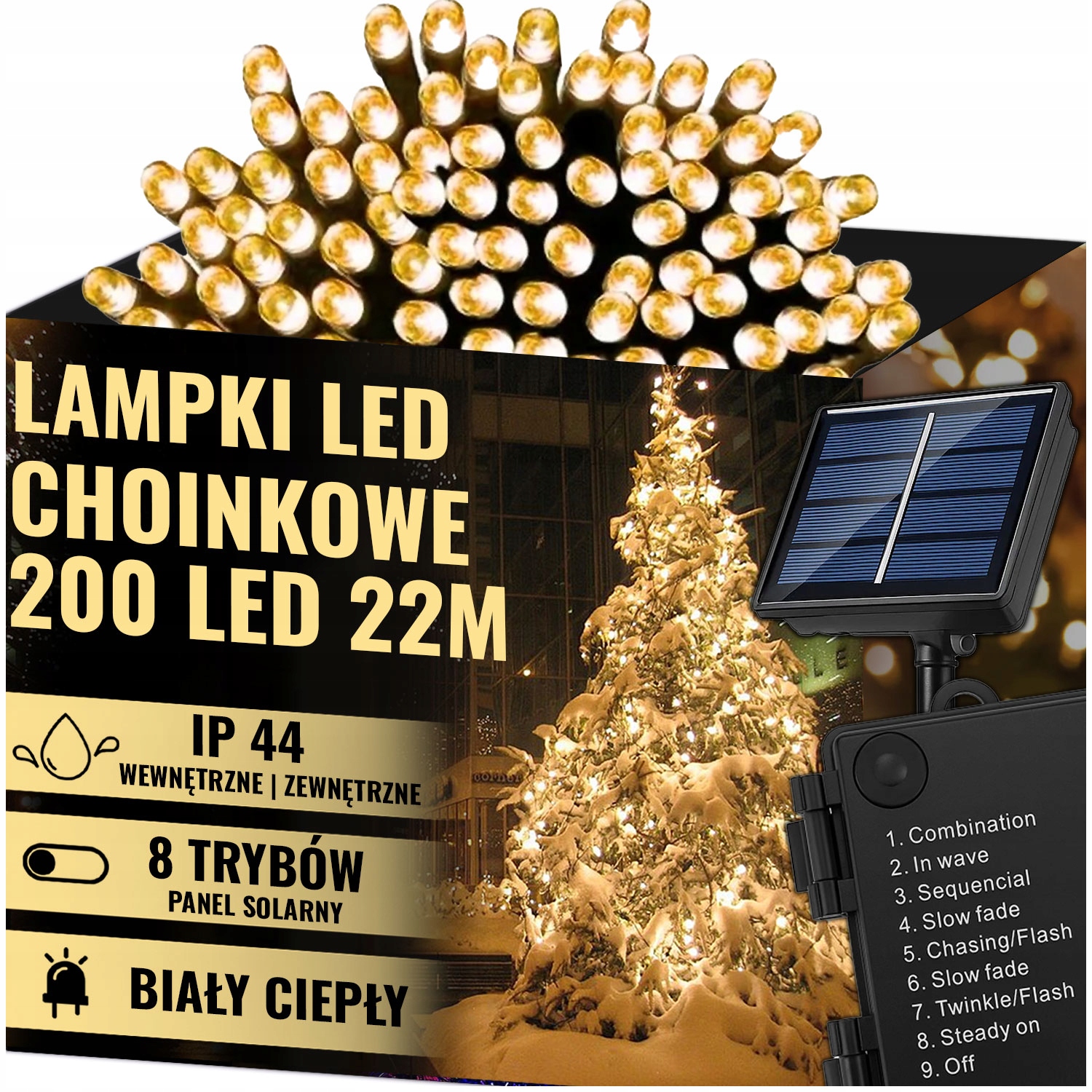 СОНЯЧНІ РІЗДВЯНІ ЛАМПИ 200 LED ЗОВНІШНІ ТЕПЛИЙ БІЛИЙ РІЗДВЯНИЙ 22M