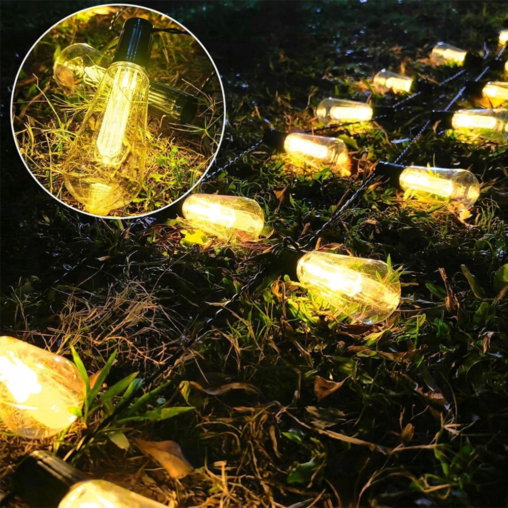 Наш сонячний гірляндний світильник водонепроникний і стійкий до ударів за стандартом IP65, виготовлений із міцного пластику лампи Едісона, набагато безпечнішого, ніж скляні лампи. Термін служби лампи: понад 50 000 годин, може витримувати екстремальні температури, дощ, вітер, жаркий або вологий клімат, ідеально підходить для тривалого використання в приміщенні та на вулиці. Кожна лампочка залишається холодною навіть після багатьох годин використання.