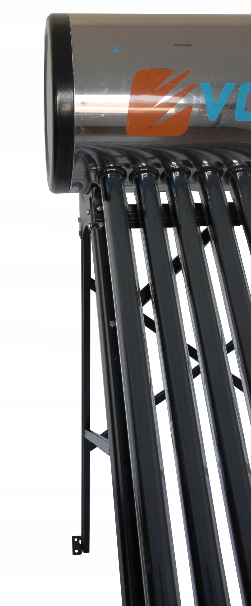 - Рама, на якій розміщені резервуар для води та вакуумні трубки, сконструйована таким чином, що її можна розмістити на пласкій поверхні. або похилій поверхні. Кут нахилу рами оптимальний для досягнення найвищої ефективності вакуумних трубок.