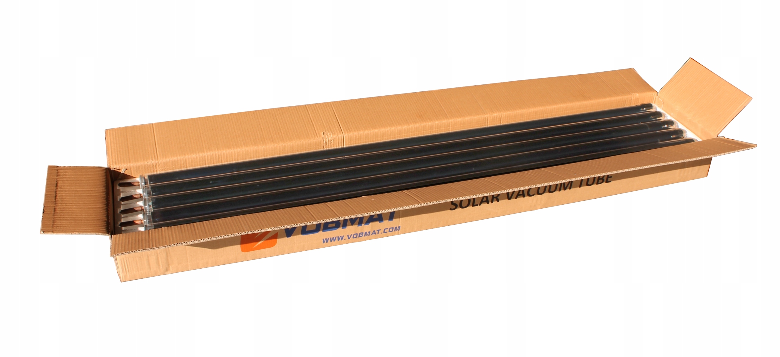 - Вакуумні трубки виготовлені з високоякісного боросилікатного скла. Між двома шарами скла є вакуум, який є чудовим ізолятором, що запобігає втратам тепла. На скло нанесено потрійний поглинач останнього покоління ALN/AIN-SS/CU, який використовується для концентрації прямого або розсіяного сонячного випромінювання. Окремі шари нанесеного поглинача використовуються для поглинання сонячного випромінювання та перетворення його в теплову енергію. Завдання наступних шарів поглинача полягає в тому, щоб зберегти якомога більше енергії всередині вакуумних трубок, запобігаючи її втратам через інфрачервоне випромінювання. Температура всередині труб може досягати майже 300 0С. Усередині кожної вакуумної трубки знаходиться алюмінієвий радіатор, в центральній частині якого знаходиться мідна трубка (теплова трубка). Мідь, яка використовується для виробництва теплопроводу, не містить кисню, що забезпечує тривалу і надійну роботу труби. Речовина міститься всередині теплової трубки та починає кипіти при температурі 25C.