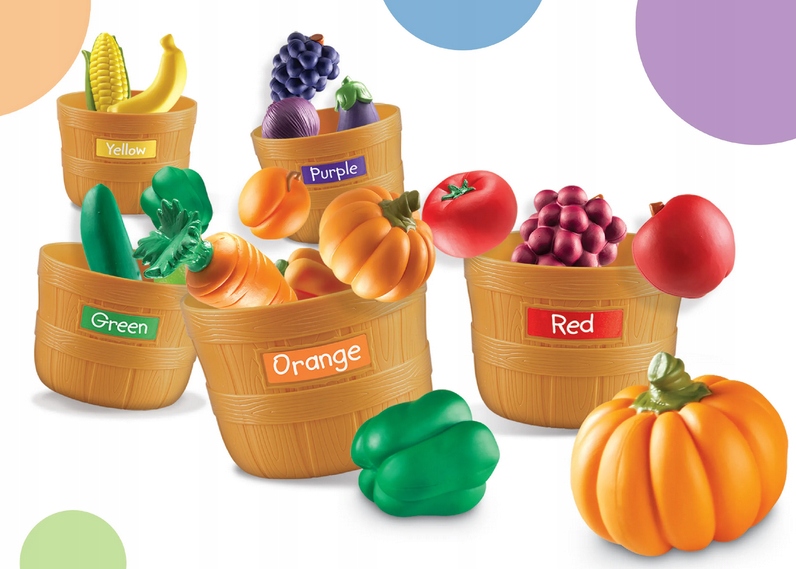 Набір містить 25 овочів та фруктів у 5 кольорах і 5 відрах та п’ять барвистих наклейок з назвами кольорів.