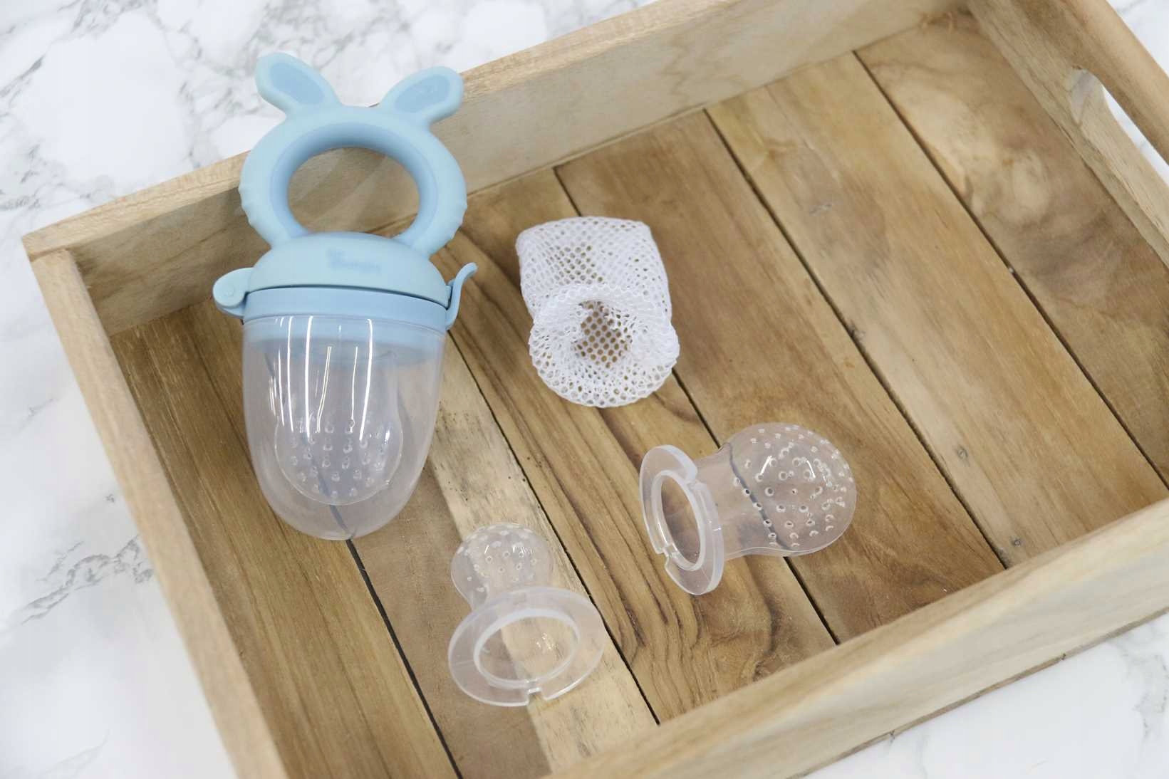У набір входять 3 різні соскиі сітка для фруктів. Використовуючи їх, ви мінімізуєте ризик задихатися, коли ваша дитина навчиться ковтати тверду їжу, особливо фрукти.
