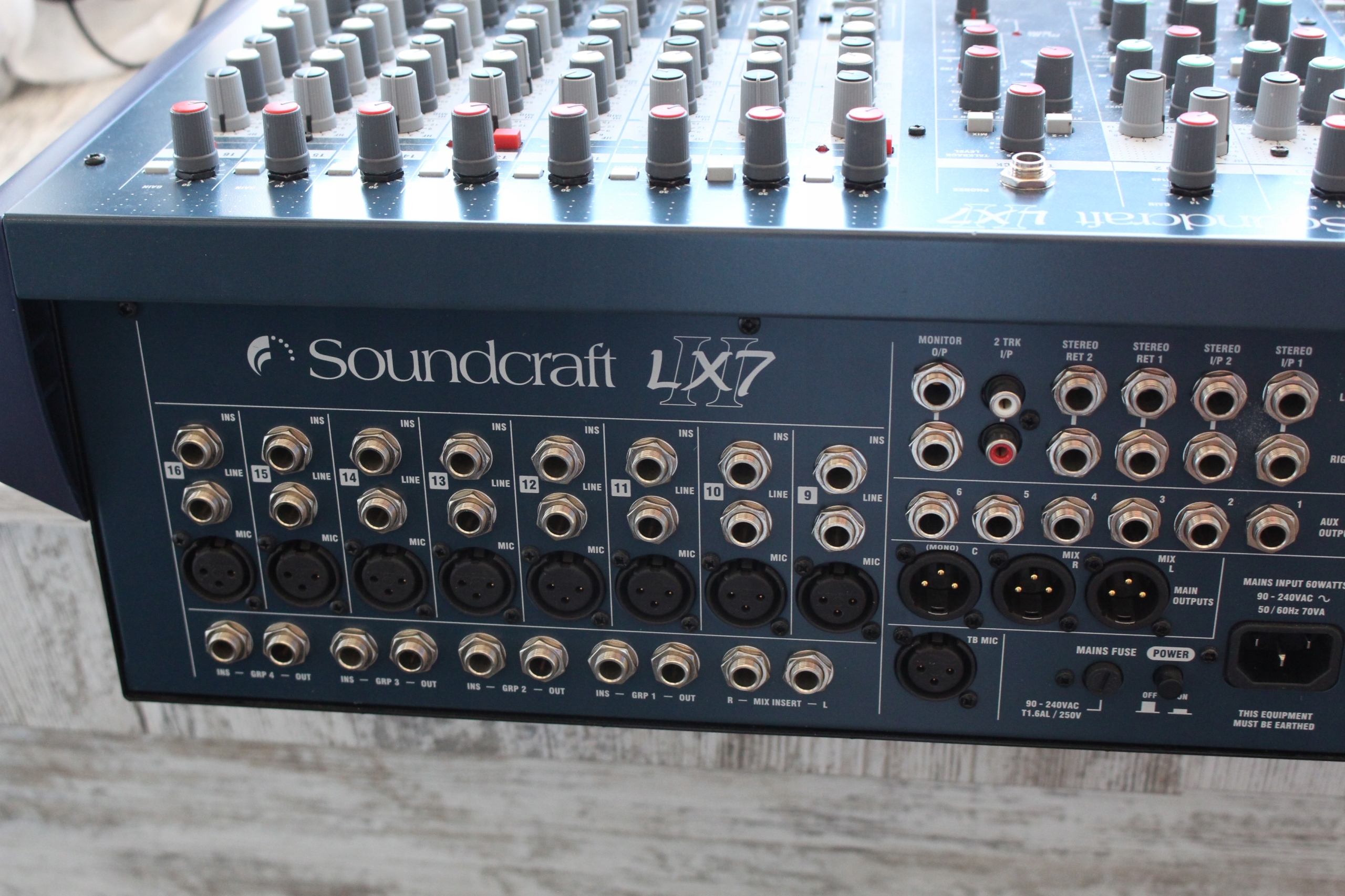 Стандартні характеристики Soundcraft LX7II включають 16 моно входів і чотири стерео входи/виходи з чотирма групами, головний стерео вихід і виділений моно вихід для центральних кластерів. Перші 8 входів мають прямі виходи, придатні для багатодоріжкового запису, і шість допоміжних входів.
