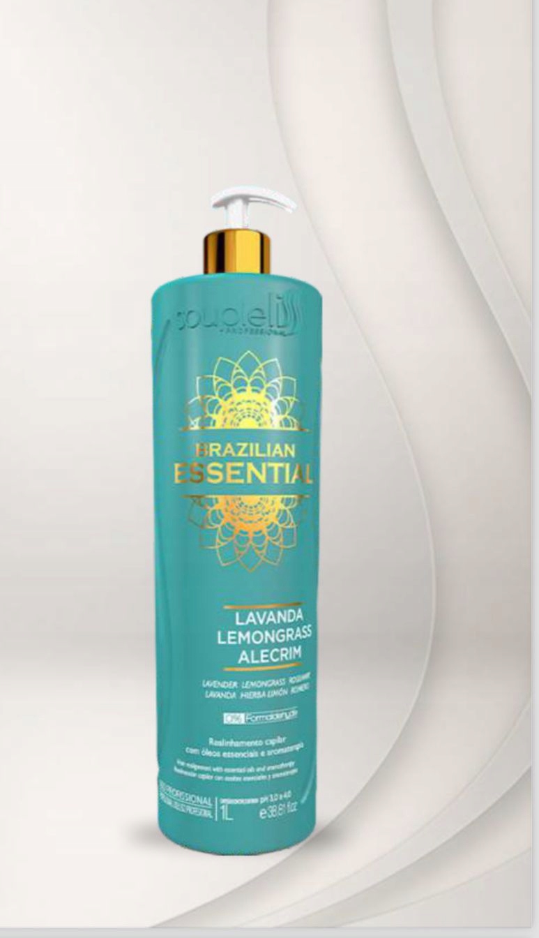 BRAZILIAN ESSENTIAL SOUPLELISS PROFESSIONAL - термокоригуючий засіб на основі ефірних олій лаванди, лемонграсу та розмарину. Це активні компоненти, які заспокоюють шкіру голови, борються з сухістю волосся і живлять пасма. Ці матеріали також діють як ароматерапія для волосся та забезпечують блиск, м’якість та ідеальне зменшення об’єму волосся.