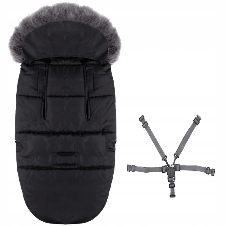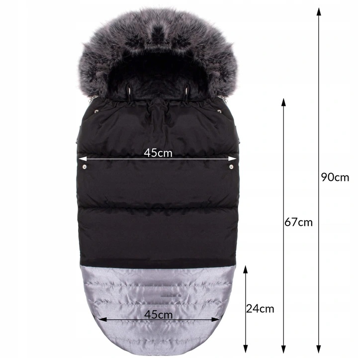 наповнений м'яким, густим і приємним плюшем дуже тепле, а хутро навколо капюшона нагрівається. Повністю завершено штучним спальним мішком з хутром та додаванням срібної елегантної тканини. Хутро може бути розстебнутим. спальний мішок, або коли вам потрібно швидко позбутися додаткового шару (наприклад, в'їзд до кімнати з суду). Це також полегшує покладання дитини всередину спального мішка.