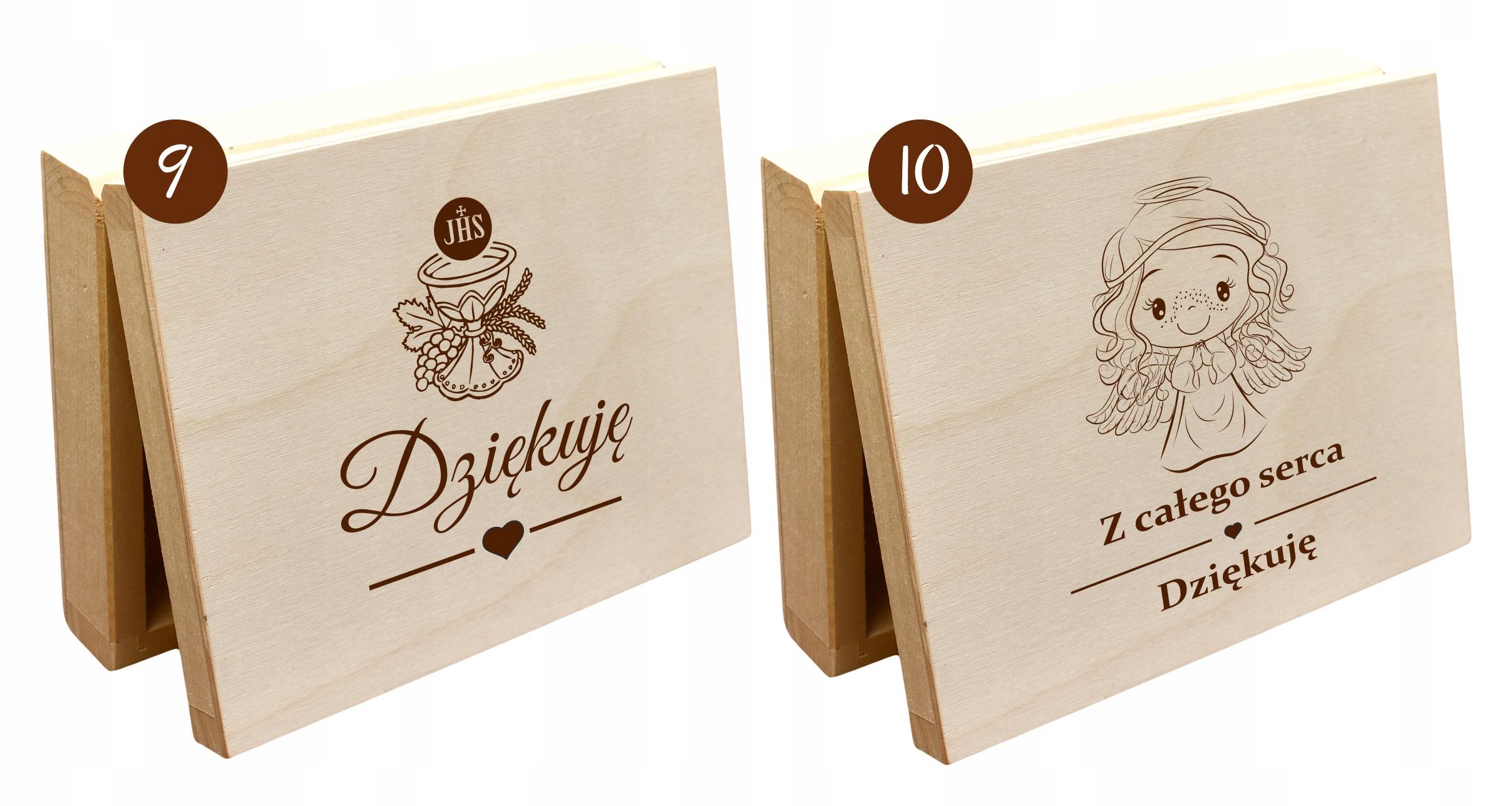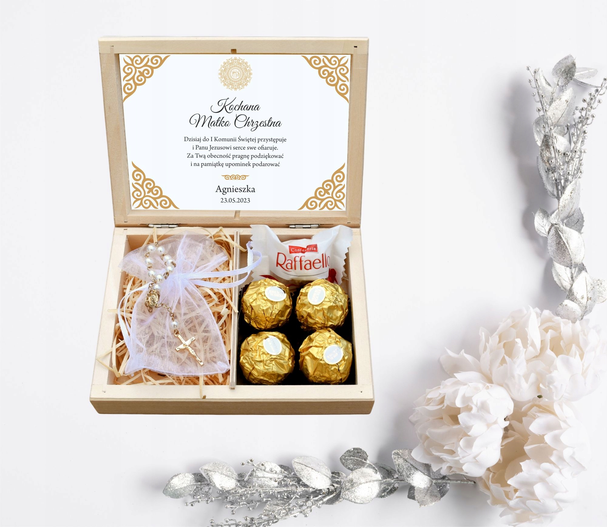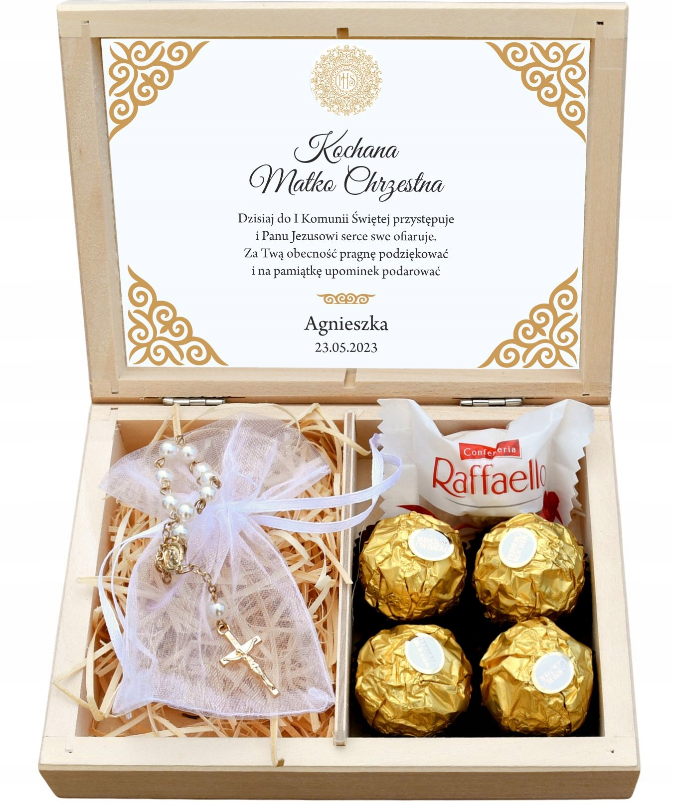Шкатулка виготовлена з натурального дерева. Чудово виглядає з гравіюванням. Крім того, декоративний папір підкреслює ефектний зовнішній вигляд. Коробку прикрашає милий лист подяки, ім’я дитини та дата Першого Святого Причастя чи Хрещення.