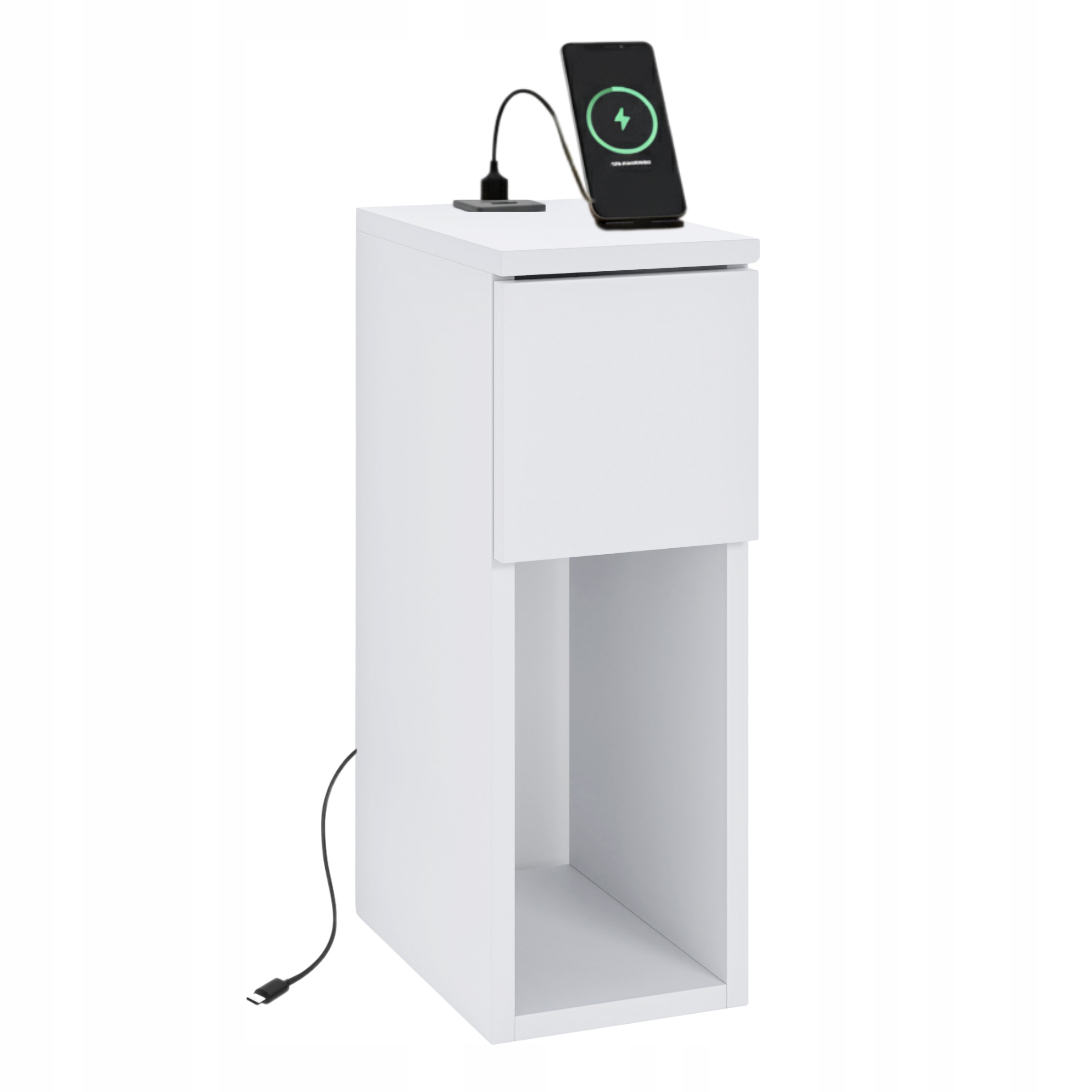 Вузька тумбочка з ящиком і полицею білого кольору - ідеальне рішення для людей, які шукають функціональні та стильні меблі для невеликих приміщень. Його сучасність підкреслюєтьсянепомітно встановленим USB-портом і портом 5 В Type-C на стільниці,який дозволяє зручно заряджати телефон або планшет, не встаючи з ліжка.