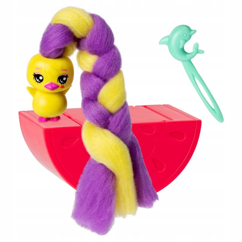 Унікальна текстура наддовгого волосся Candylocks Pets, натхненна цукровою ватою, полегшує укладання. Волосся зберігає форму і не розсипається. Створюйте коси, спіралі, хвостики тощо - можливості зачісок безмежні! Всередині упаковки є один аксесуар, який прикрасить казкові зачіски. Пограйте зі своїм улюбленцем на стильній грядці з кавунами або помістіть її всередину та візьміть із собою в подорож. Щоб отримати ще більше задоволення, додайте до своєї колекції ляльку Candylocks (продається окремо) — у цих чарівних ароматичних ляльок довге волосся з ароматною солодкою ватою, як у тварин!