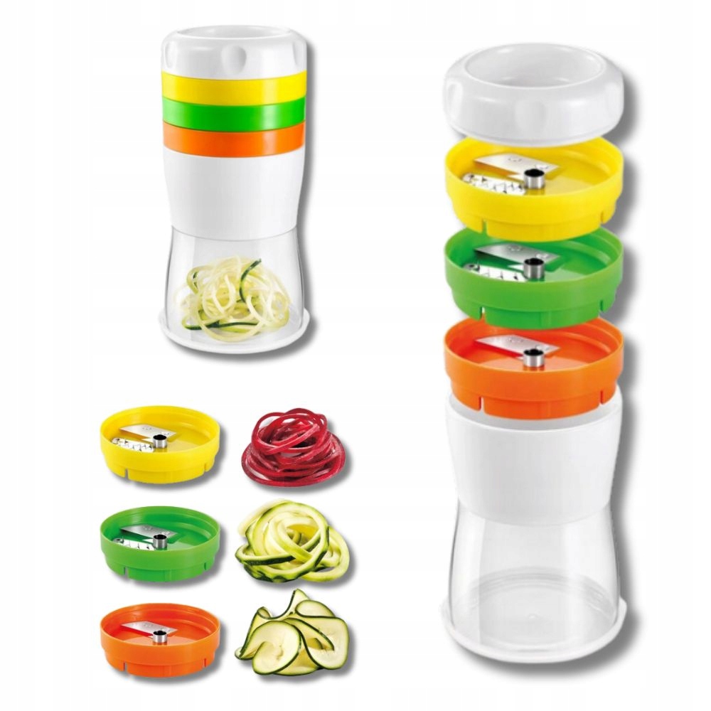 Ідеально підходить для приготування тонких ниток, спагетті та спіралей з моркви, огірка, цукіні, білої редьки, буряка, картоплі, яблука тощо. З 3 лезами з високоякісної нержавіючої сталі та захисною ручкою для легкого нарізання без залишків. Можна мити в посудомийній машині. 3 роки гарантії.