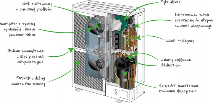 Завдяки найсучаснішим технічним рішенням зовнішній модуль характеризується дуже тихою роботою, створюючи шум при рівень приблизно 46 дБ.