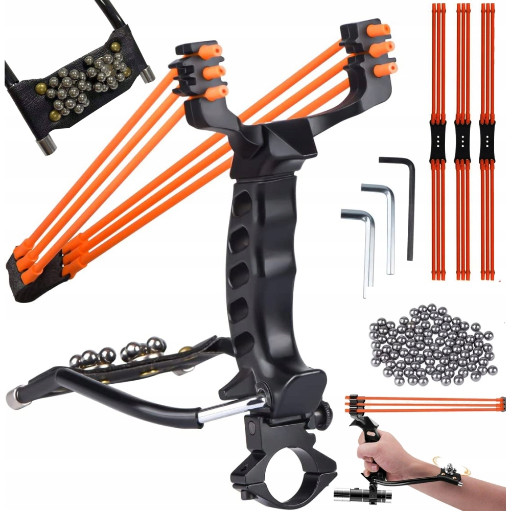 - 🟡 【Рогатка】: Наша професійна мисливська рогатка має широку дугу та потрійну міцну гумку. Ергономічна безступінчаста регульована рукоятка надійно та зручно лежить у руці.