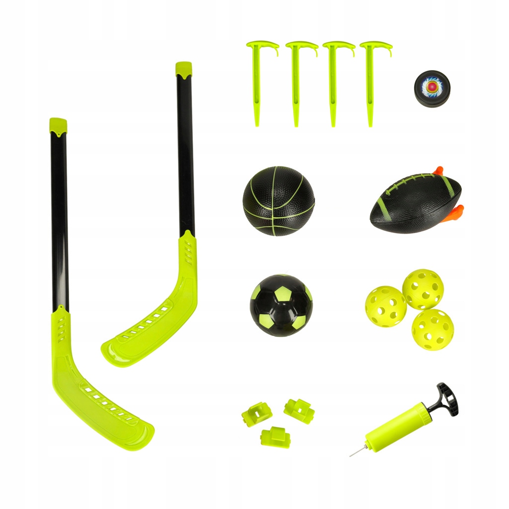 футбол, баскетбол, хокей, регбі, а також вправи далі Точність - все це може запропонувати наш набір. Вам не потрібно купувати Окремі цілі для кожного спорту - завдяки модульному дизайну, який ви можете Один раз -два перетворіть футбольний гол у циферблат, щоб здійснити точність або Кошик кошика. Більше того, вам не доведеться турбуватися про придбання необхідного Навчальне обладнання. У вас вже є всі необхідні аксесуари в наборі: Три надувні кульки (для футболу, баскетболу та регбі), пластикові кульки для кидків на точність, диску та хокейні палички, навіть сітка, насос і Пластикова оселедець - це якір.