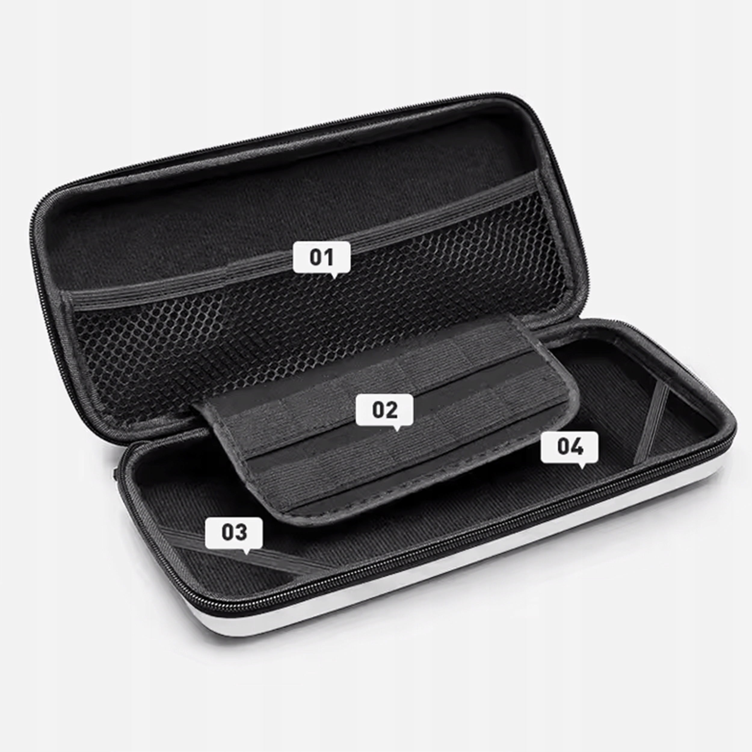Існує 10 слотів для ігор всередині - завдяки цьому ви завжди можете мати улюблені назви з собою. Крім того, сітчаста кишеня, прикріплена на блискавці, дозволяє зберігати невеликі аксесуари: навушники, USB -кабель, зарядний пристрій, адаптер або навіть невеликий бланк. Все замовлено, в одному місці.