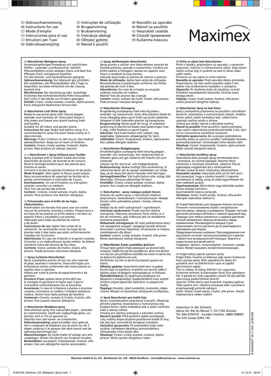 - Натуральні інгредієнти: суміш натуральних інгредієнтів ніжно очищає листя рослин і надає їм природного блиску. Засіб складається з олії перцю, лаванди і розмарину. Додатково збагачений делікатною очисною речовиною.