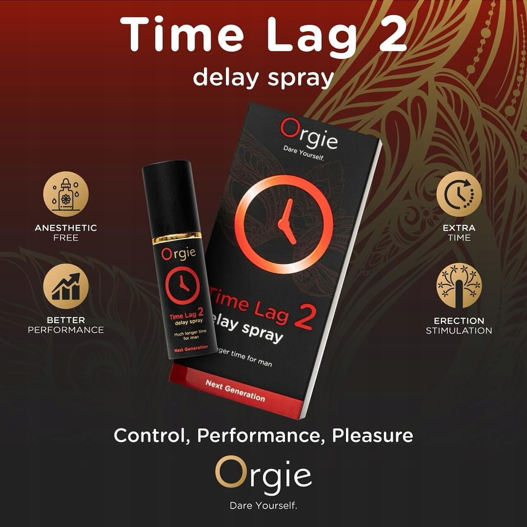 Orgie Time Lag 2 Spray — це наступне покоління класичного спрею Time Lag Delay, який подовжує тривалість статевого акту. Його формула викликає сильнішу «десенсибілізацію» та збагачена рослинним афродизіаком – травою даміани (екстракт листя Turner Diffus), що дає кращі результати.