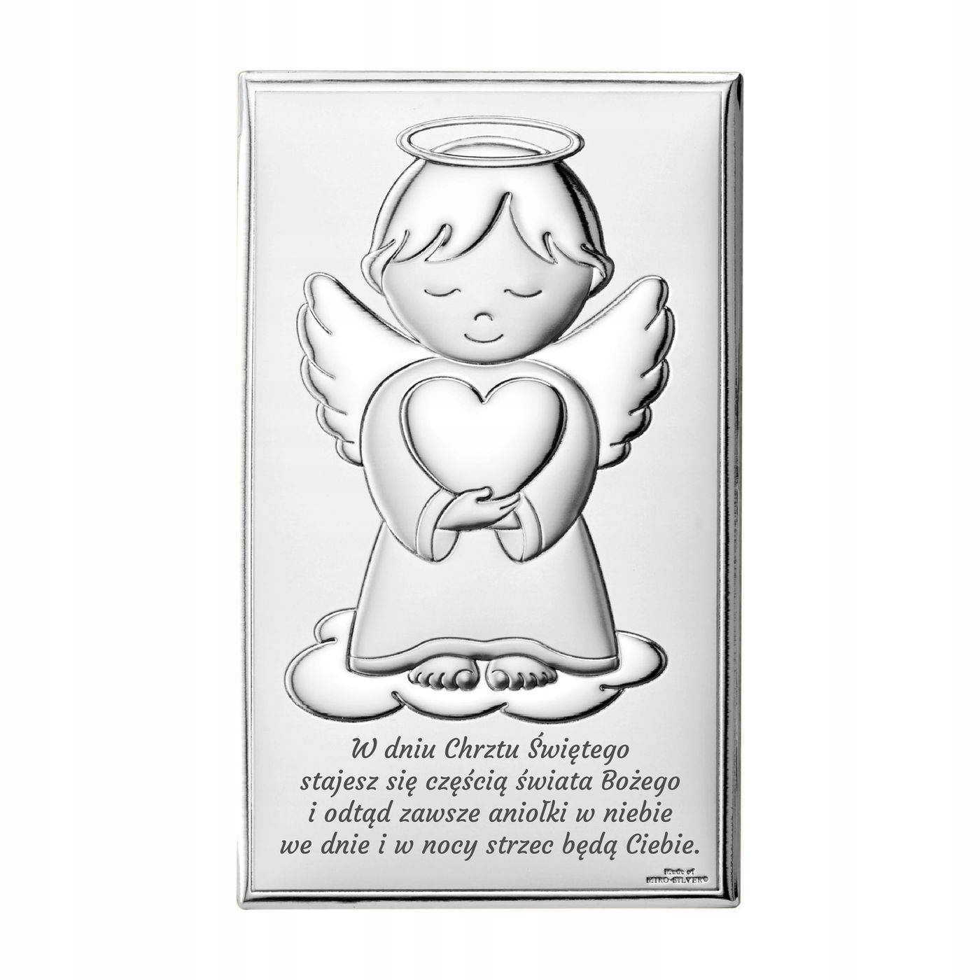 Посріблена табличка під ангелом унизу має вигравіруваний вірш до нагоди хрещення.