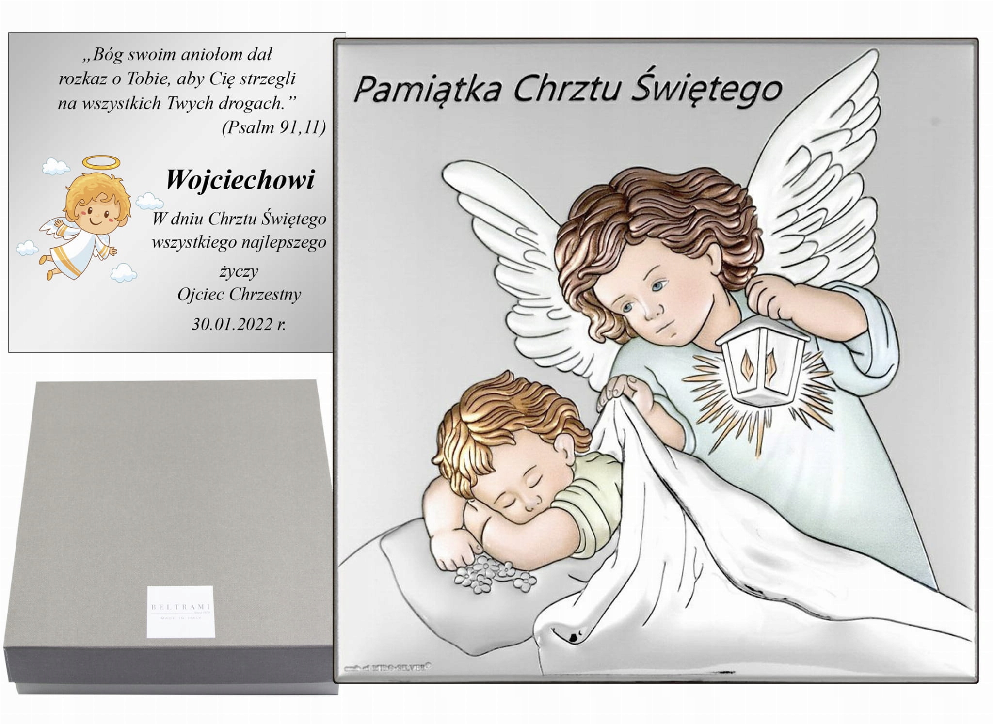Картина із зображенням Ангела-охоронця - ідеальний подарунок на Святе Хрещення. Висока якість виготовлення, вишукана обробка, елегантна упаковка – все це створює унікальний сувенір на довгі роки... Картина також надзвичайно практична: вона має вставну підставку, тому ми можемо поставити її на шафу чи комод або повісити на стіні.