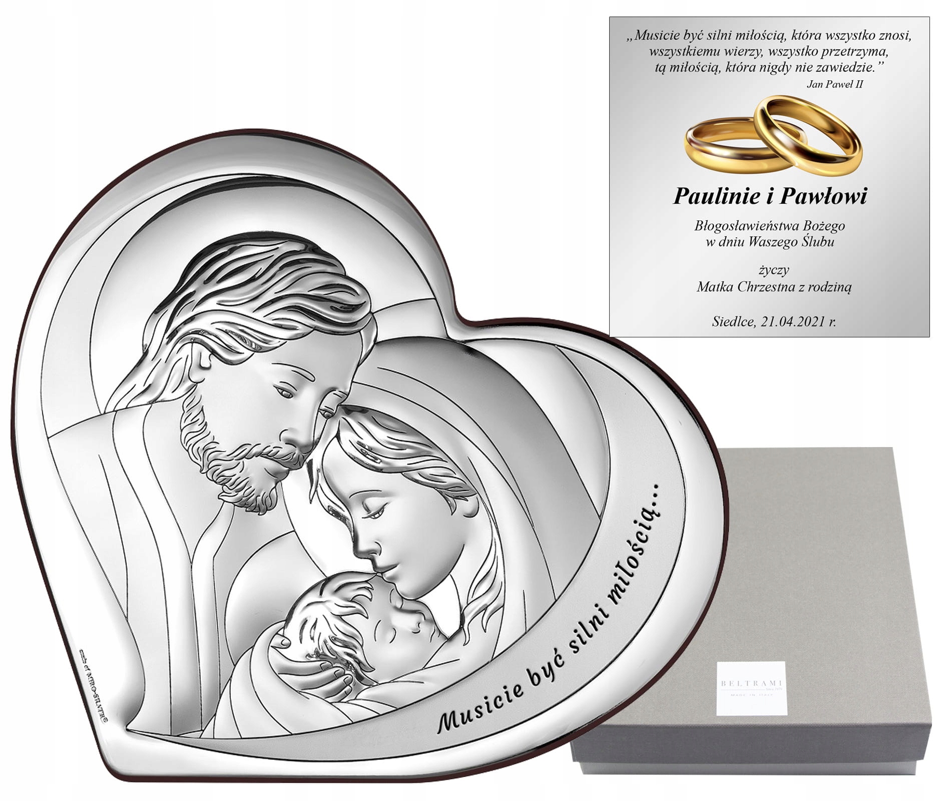Картина із зображенням Пресвятої родини у формі серця - ідеальний подарунок на Хрещення, Вінчання, Перше Причастя або День народження дитини. Висока якість виготовлення, вишукана обробка, елегантна упаковка – все це створює унікальний сувенір на довгі роки... Картина також надзвичайно практична: вона має вставну підставку, тому ми можемо поставити її на шафу чи комод або повісити на стіні.
