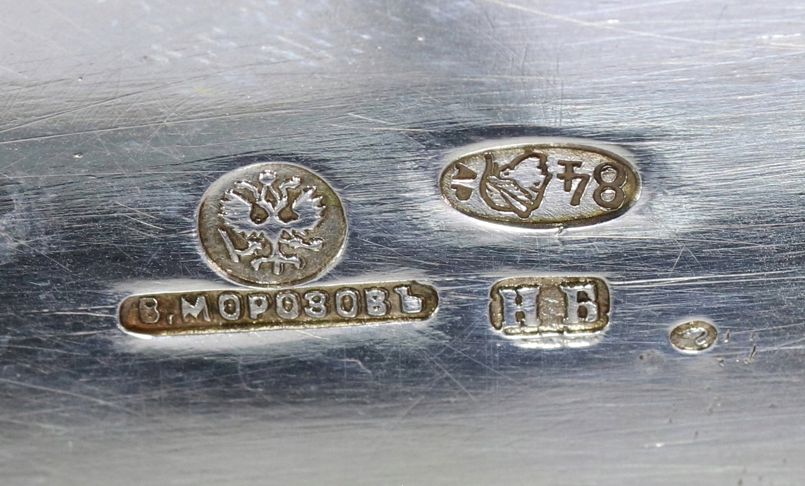 - Пластина на дні має клеймо (84), клеймо універмагу та підпис майстра, який виготовив предмет. Також можна побачити зображення двоголового царського орла з короною, що позначає постачальника двору.