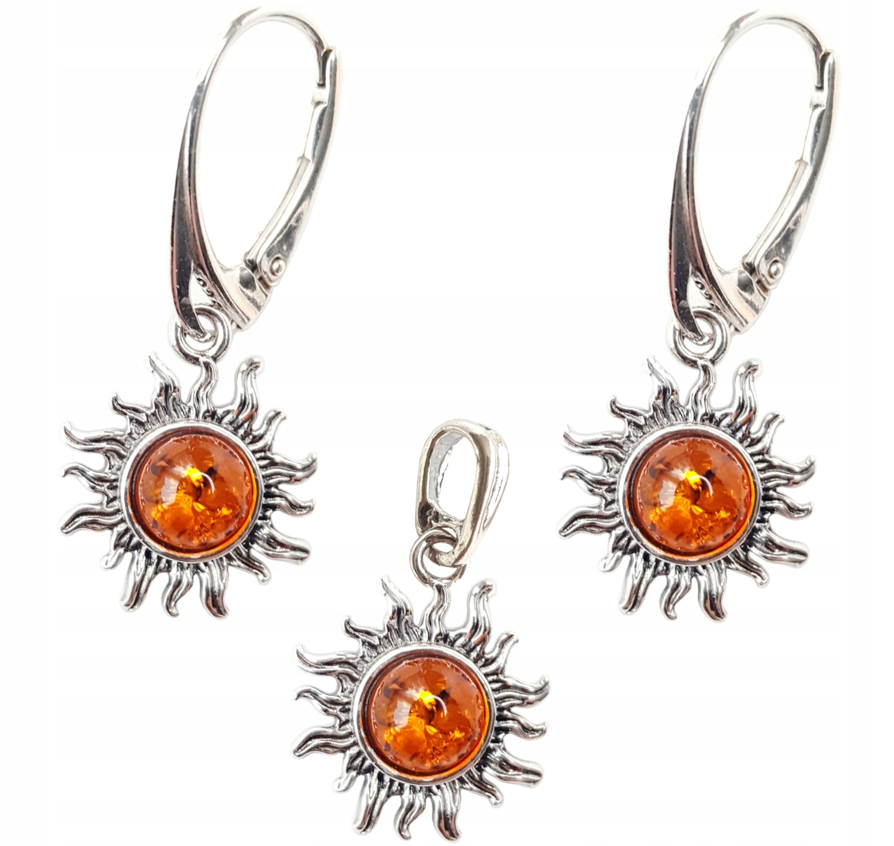 Пропонований КОМПЛЕКТ із срібних сережок і бурштинової підвіски є повністю новим і походить від місцевих ювелірів-митців із Гданська та околиць, які займаються дизайном бурштину на щодня. Очки в сережках і підвісці виготовлені зі справжнього бурштину.