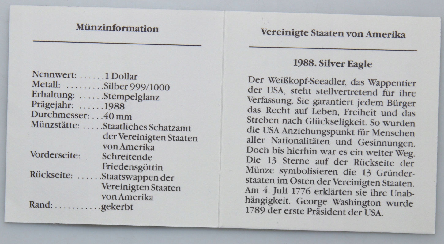 США - монета 1 унція Ag 999 срібло - 1 долар 1988 + КОРОБКА + СЕРТИФІКАТ