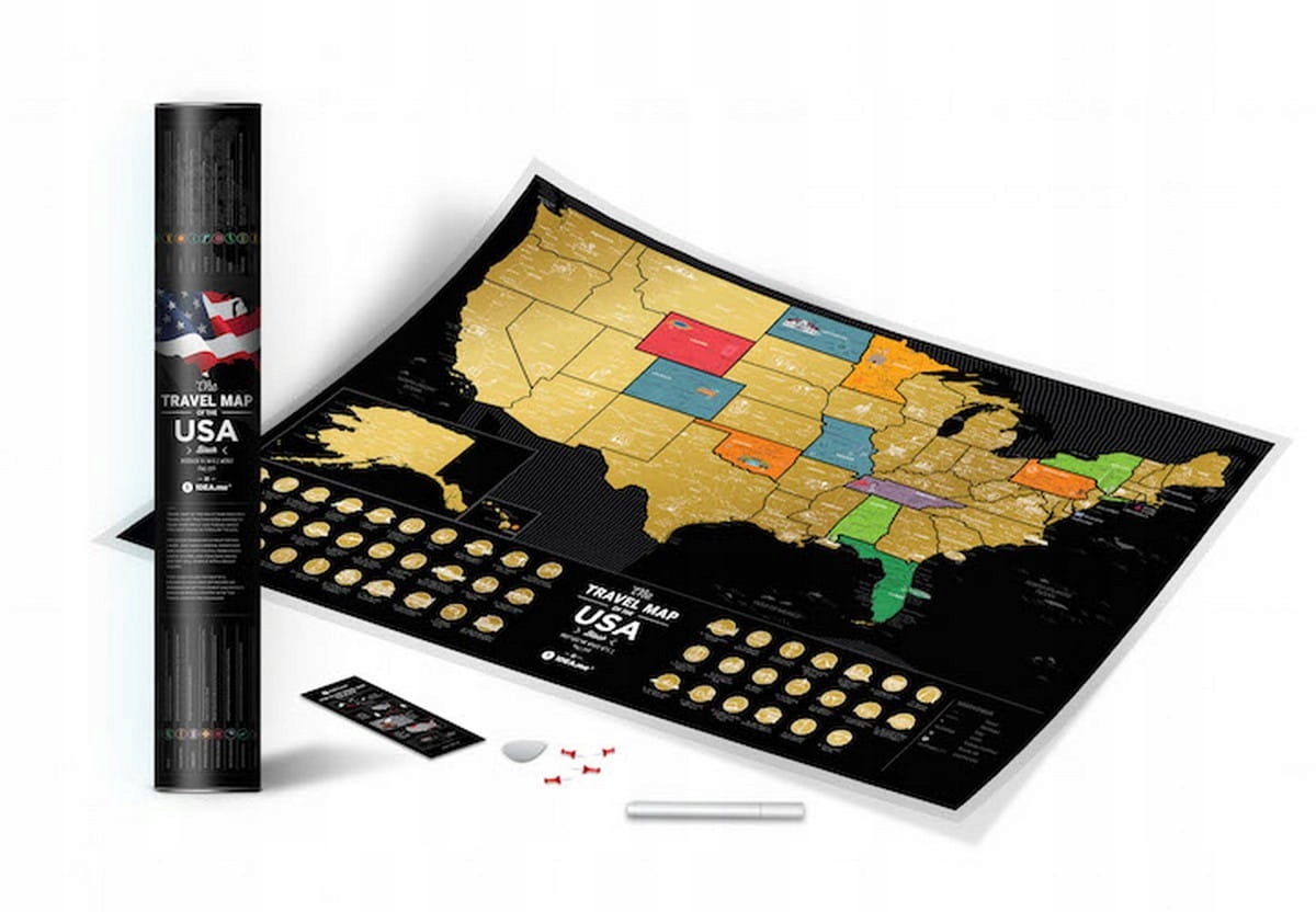 Travel Map™ USA Black — це карта Сполучених Штатів чорного кольору із золотистим покриттям. Ви можете легко позначити на карті штати, які ви відвідали, і знайти їх символи. Просто скористайтеся доданим кубиком, щоб вийняти золоту скретч-картку та відкрити для себе місця, де ви вже були, створивши вражаючий запис своїх подорожей США. Карта підходить для сучасних і креативних інтер'єрів. Це також буде працювати як подарунок для любителів США.