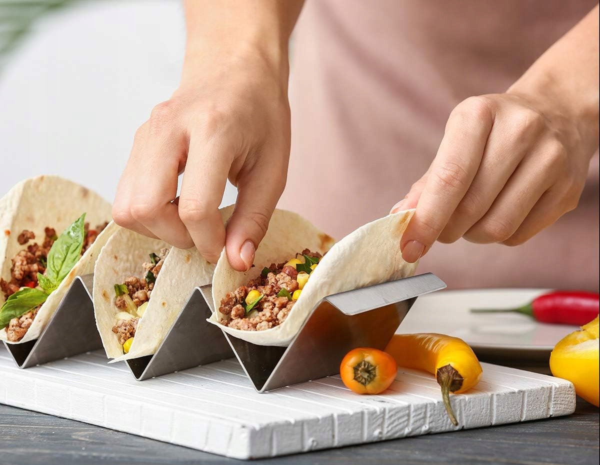 Тримач для тако хвилястої форми. Пази для розміщення мексиканської форми тако виконані у формі букви V. Їх можна використовувати як для твердих, так і для м'яких тако, завдяки чому закуска легше триматиметься у вертикальному положенні. Ви можете подати 2 або 3 тако на підставці, обертаючи основу (залежно від того, як ви розташували ручку). Підставка для тако виготовлена з високоякісної нержавіючої сталі, яка не іржавіє та надзвичайно міцна. Міцний і безпечний для їжі.