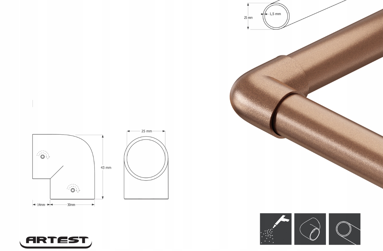 куточок 90 градусів із замком труби, меблевою паличкою, меблевим роз'ємом, FI25 мм, мідним кольором, виробником польської мови