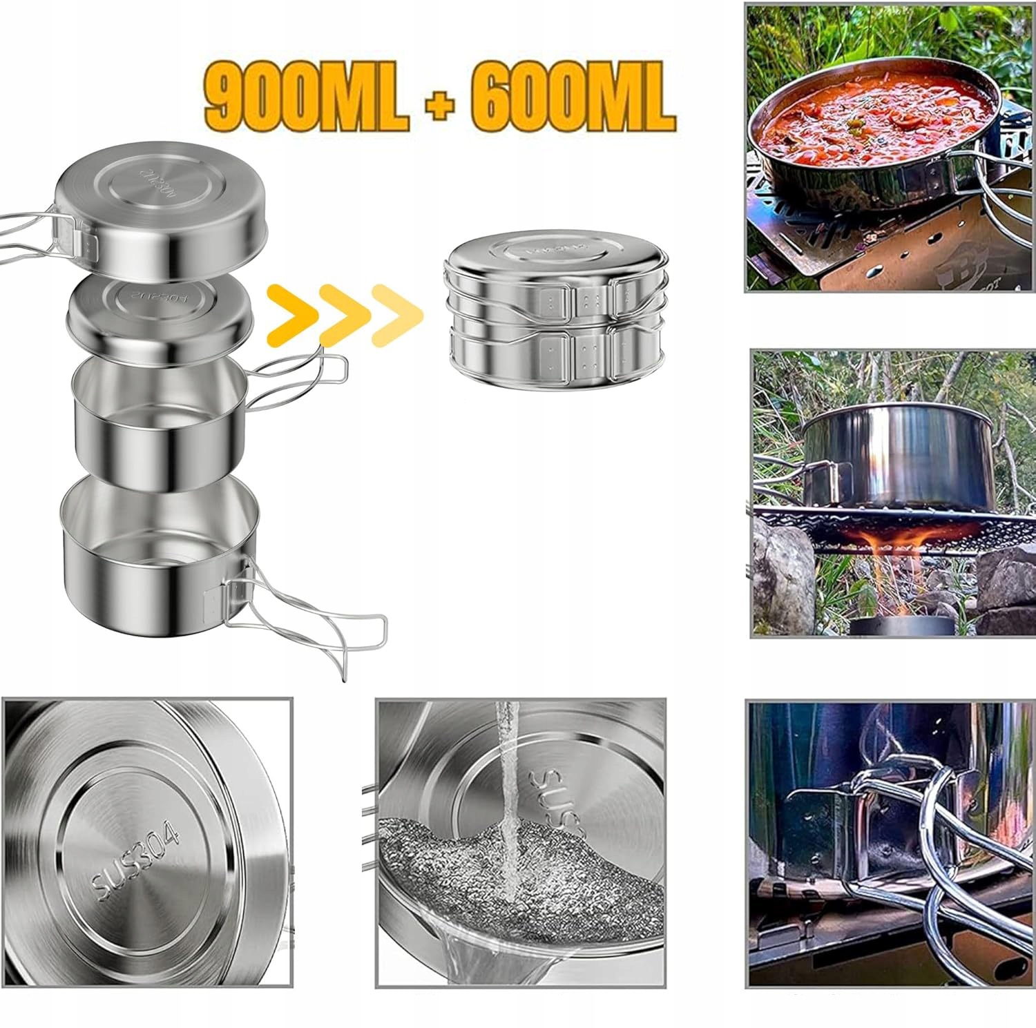 ⛺⛺ma та портативний: Набір має вкладену конструкцію, компактний розмір кухонного набору з нержавіючої сталі, горщиків та каструль може бути закладений на поверх іншого, щоб заощадити простір. Це легко переносити і його можна зберігати в рюкзаку.