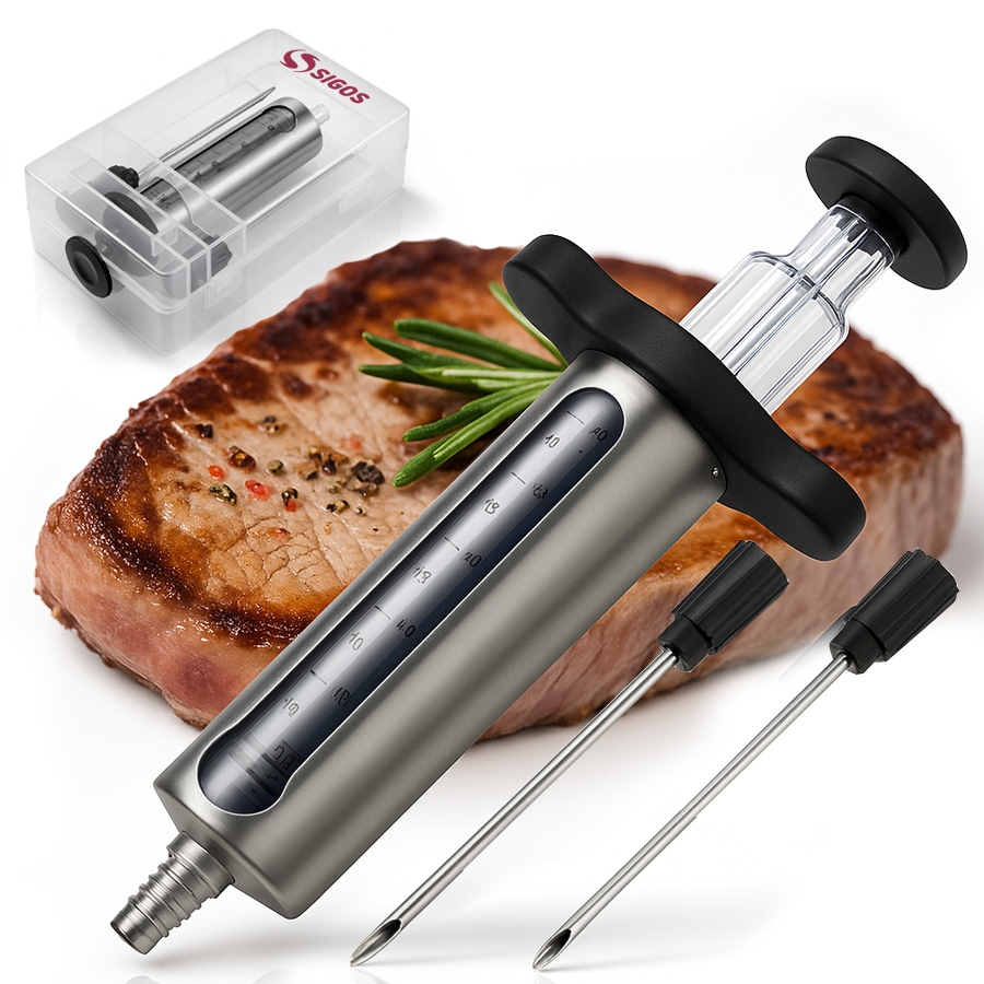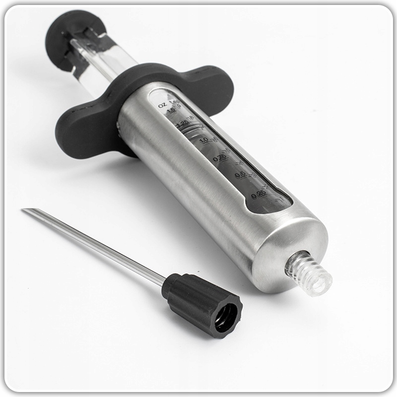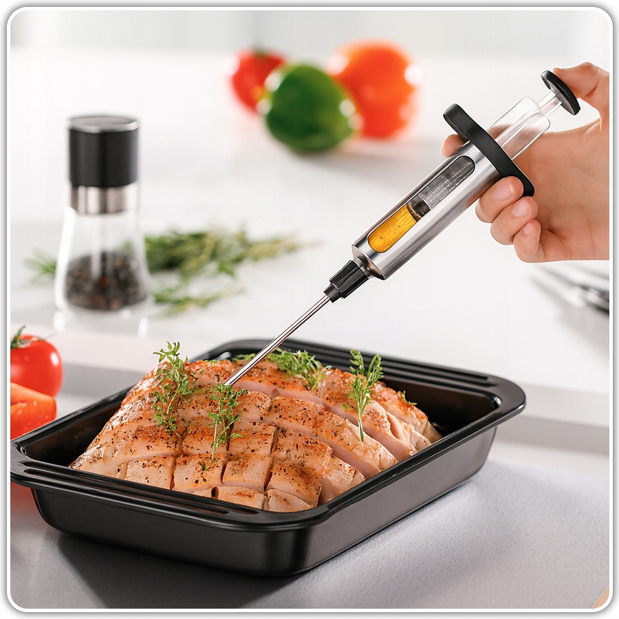 ⭐ Зробіть свої страви не лише смачнішими, але й надзвичайно соковитими завдяки професійному інжектору для маринування з нержавіючої сталі. Це незамінний інструмент на кухні кожного любителя гриля та випічки.