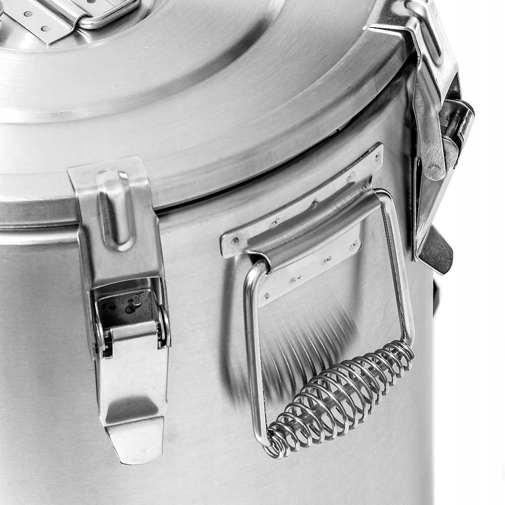 Кришка закривається на 6 міцних засувок. Вентиляційний клапан в кришці дозволяє відкривати термос з гарячою їжею. Ергономічні транспортувальні ручки для зручного перенесення.