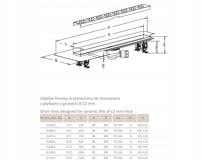 Лінійний злив призначений для використання з плиткою товщиною від 8 до 12 мм
