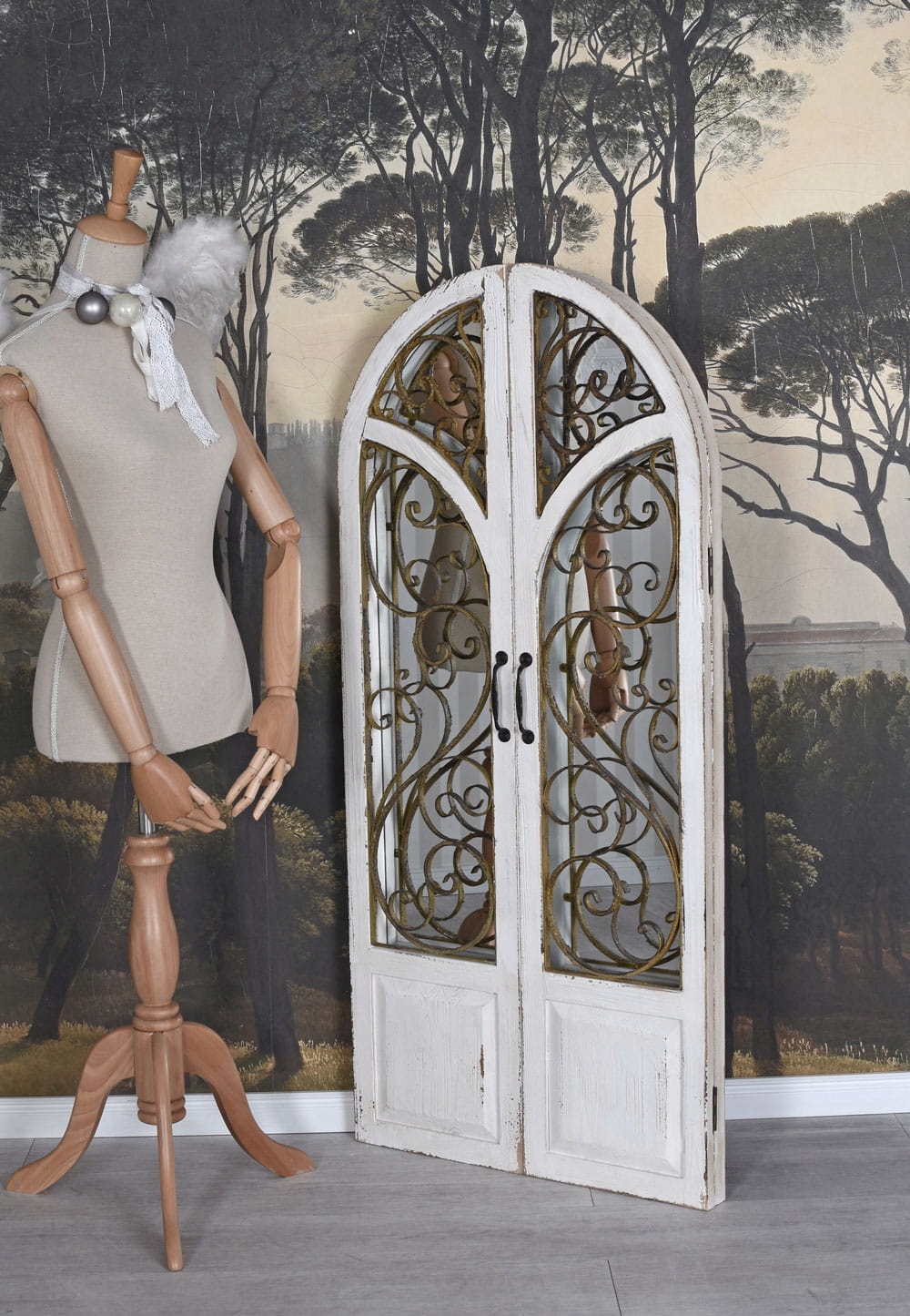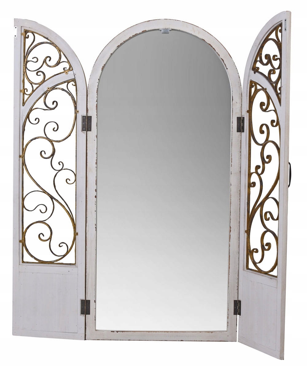 Це дзеркало має висоту 126 см і ширину 60 см (або 118 см із відкритими дверцятами). Це дзеркало ідеально підходить для будь-якого простору. Однак те, що справді виділяє це дзеркало, так це дві відкидні віконниці з металевим орнаментом, які надають йому унікального вигляду, який сподобається вашим гостям.